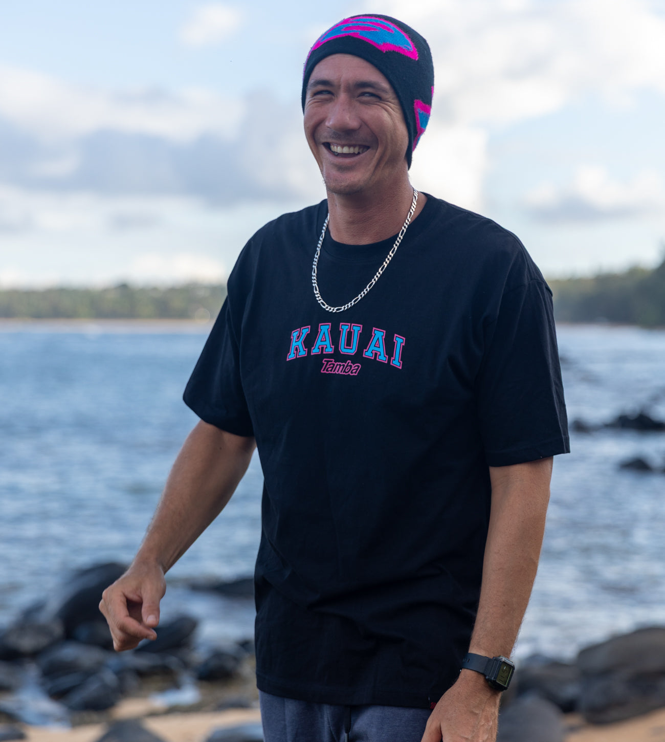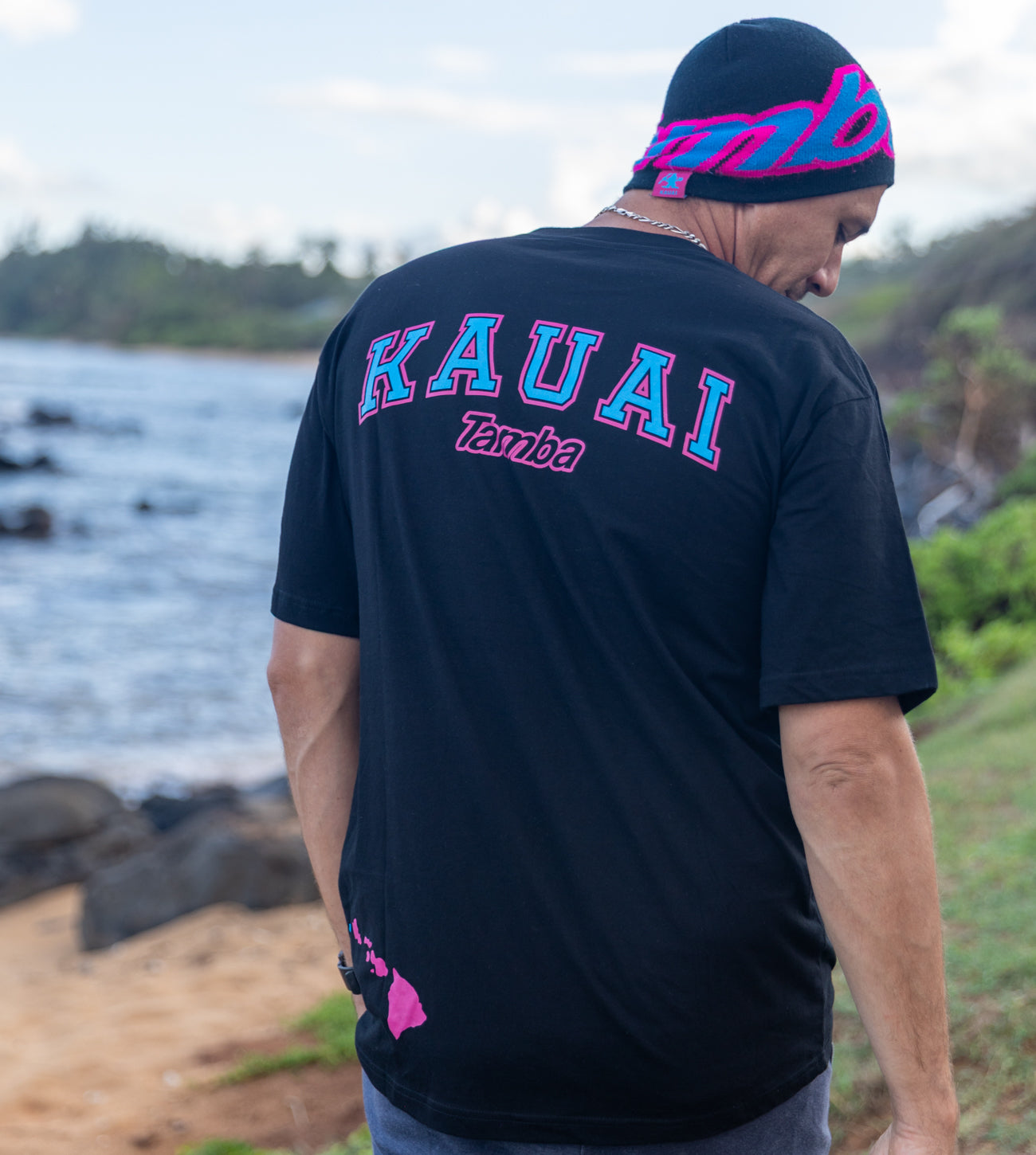 It's all happenin' on the Garden Isle! KAUAI Tamba logo on front/back, and the Hawaiian island chain on the back. Cotton knit, a soft cotton, with some nice touches like the sewn-in collar band and the authentic Tamba Warrior tag sewn onto the waistline hem. Front and back prints nearly equal in size.