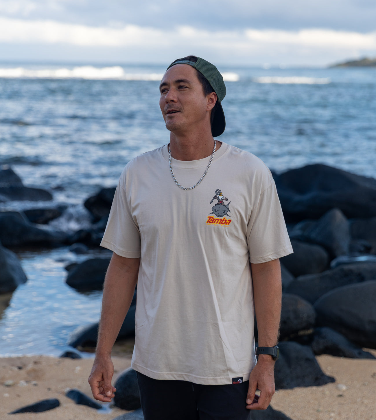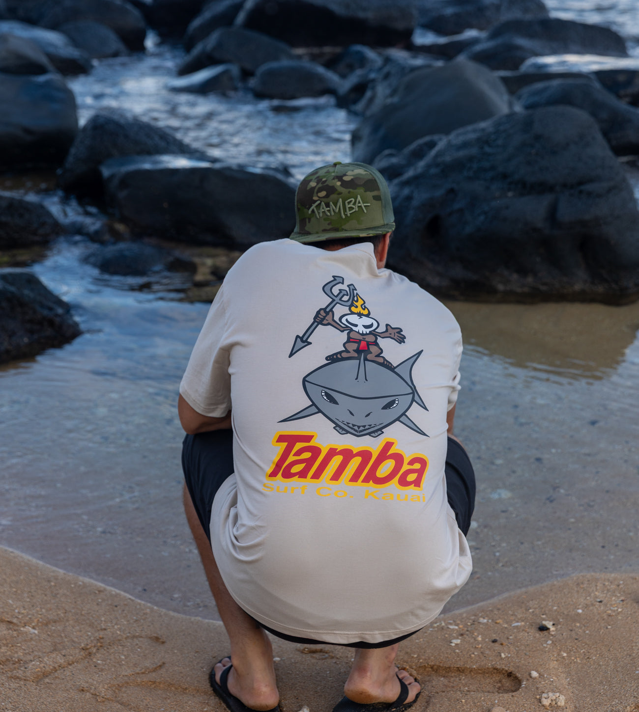 A different way to look at our ocean friends. Saddle not included. Cotton knit, a soft cotton, with some nice touches like the sewn-in collar band and the authentic Tamba Warrior tag sewn onto the waistline hem. Larger print is on da back,