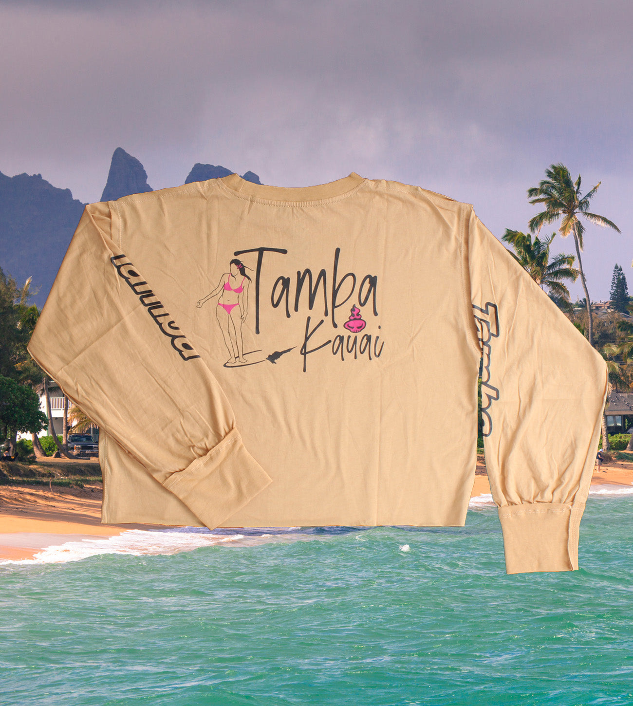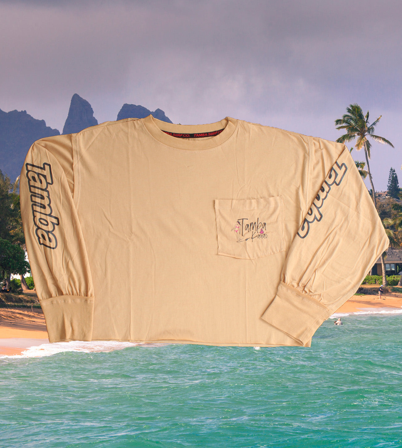 Hang Ten in style! Cotton knit, a soft cotton with some nice touches like the sewn-in collar band and authentic Tamba tag on hem. Pocket on front. Larger print on back.