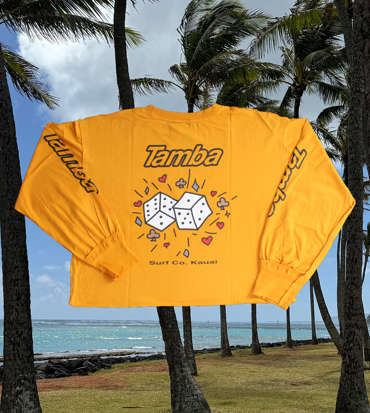 The odds are in your favor! Tamba 'Lucky Dice' design. Cotton knit, a soft cotton with some nice touches like the sewn-in collar band and authentic Tamba tag on hem. Pocket on front. Larger print on back.