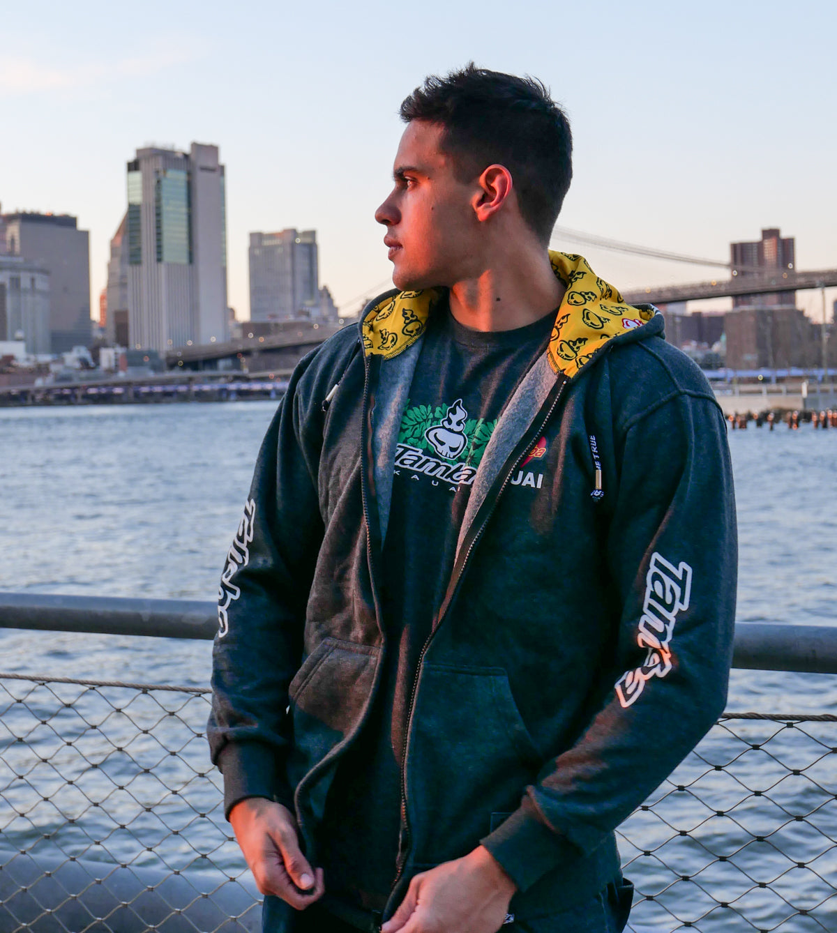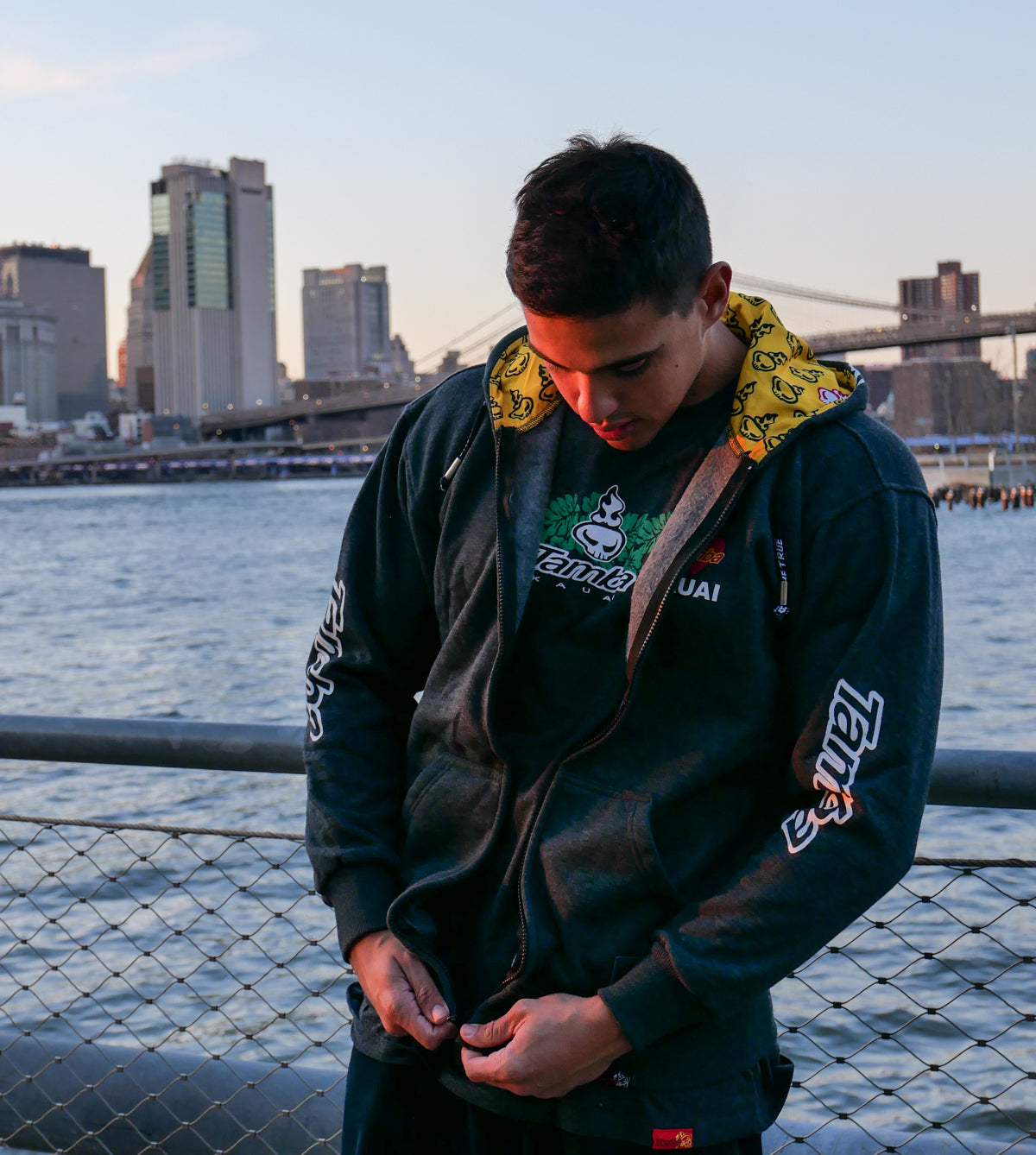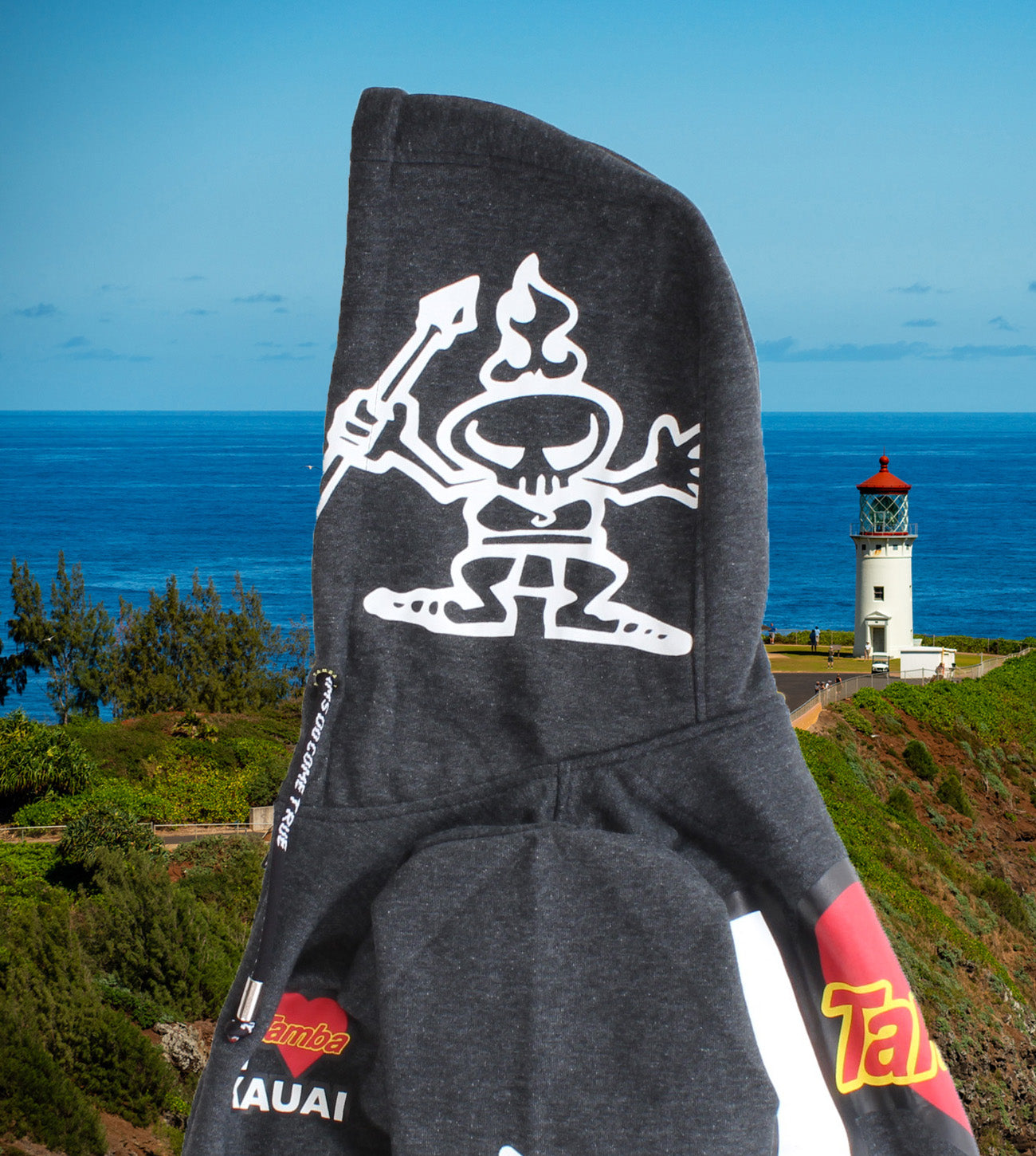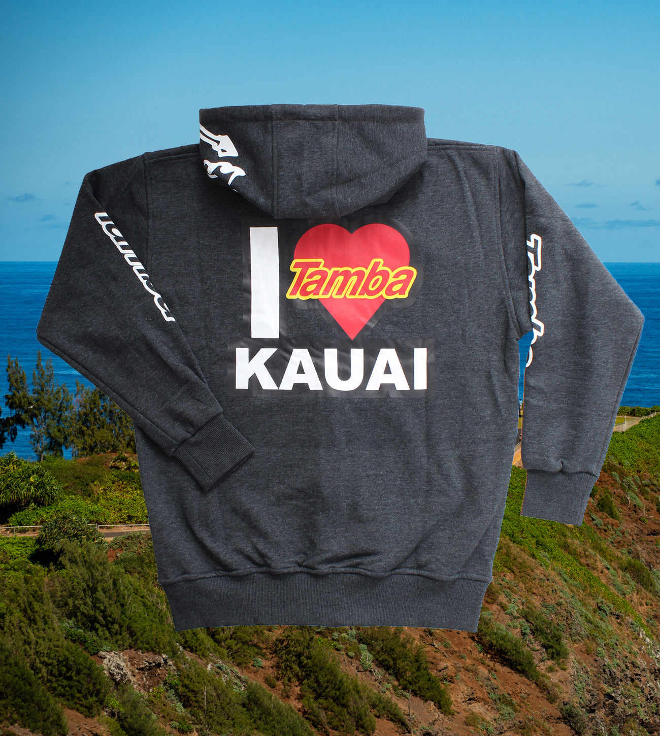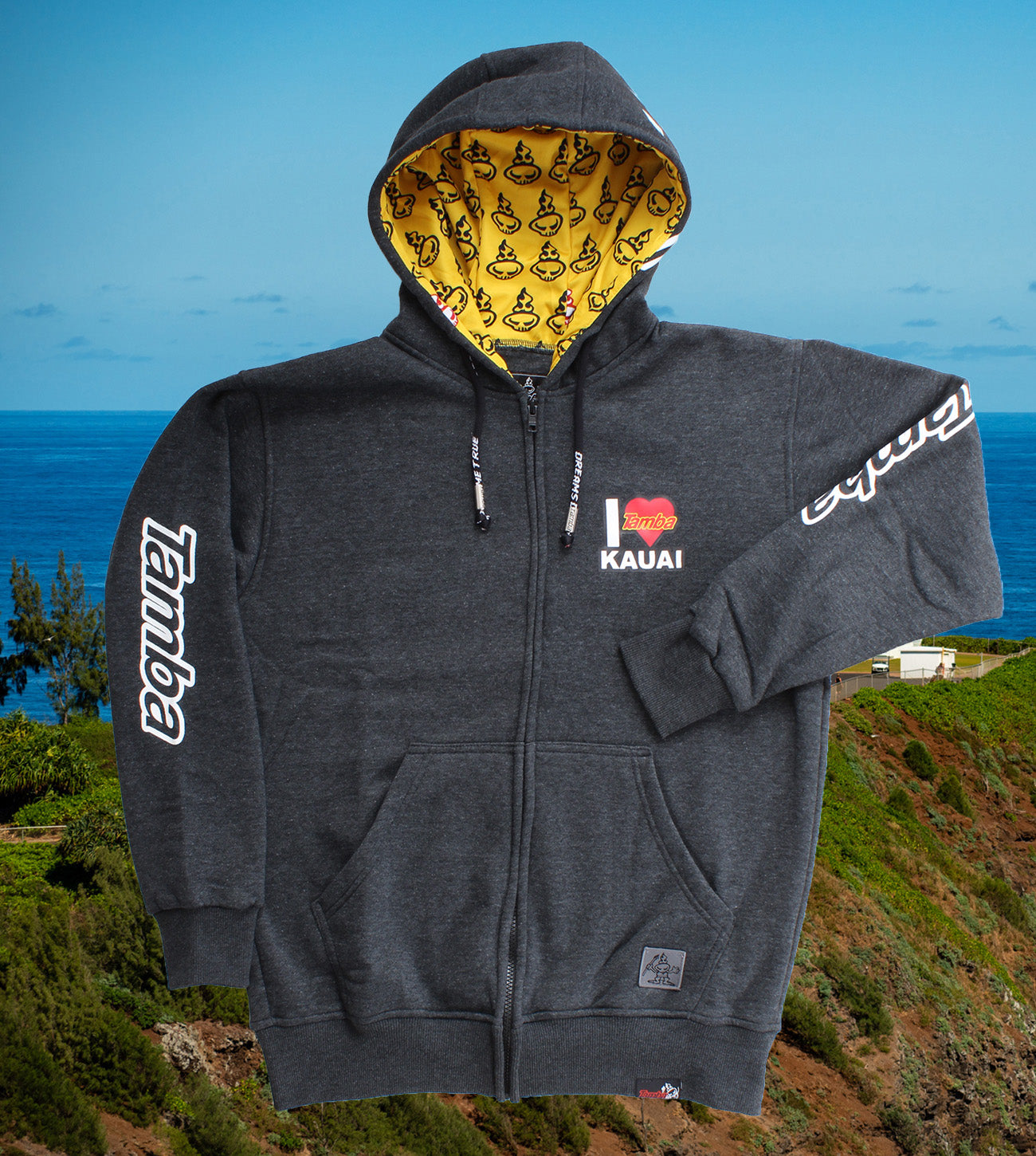 Who among us doesn't love this little gem in the ocean? 55%-45% cotton/poly fleece blend, with some nice touches like the thick, sturdy 'Dreams Do Come True' drawstrings, custom Tamba grommets, Spirit Warrior lined hood, and the authentic Tamba Warrior tag sewn onto the waistline hem. Two front pockets, Warrior emblem on left pocket. Larger print is on da back, with warrior on one side of the hood and tamba logo on both sleeves. Just. For. You.