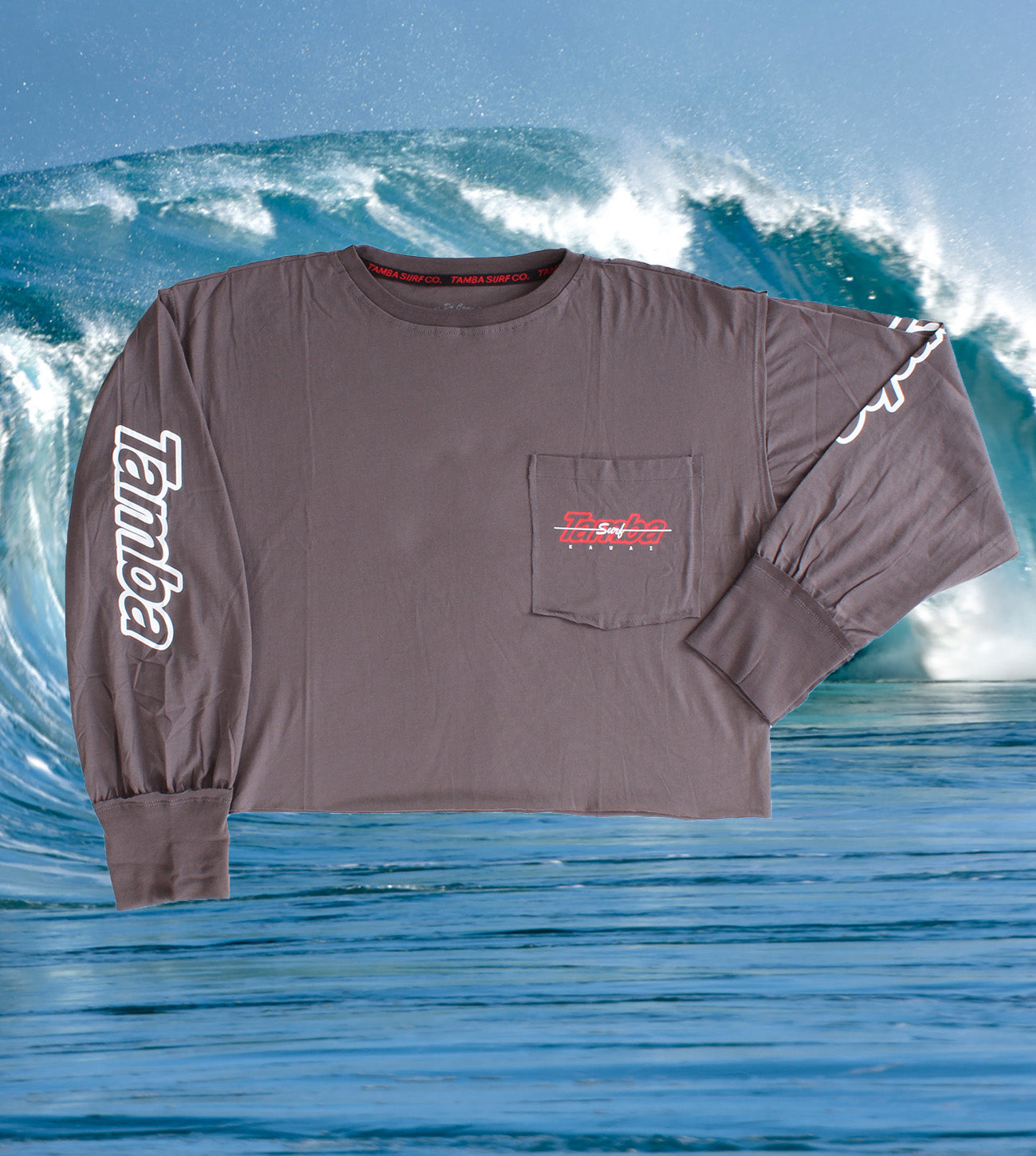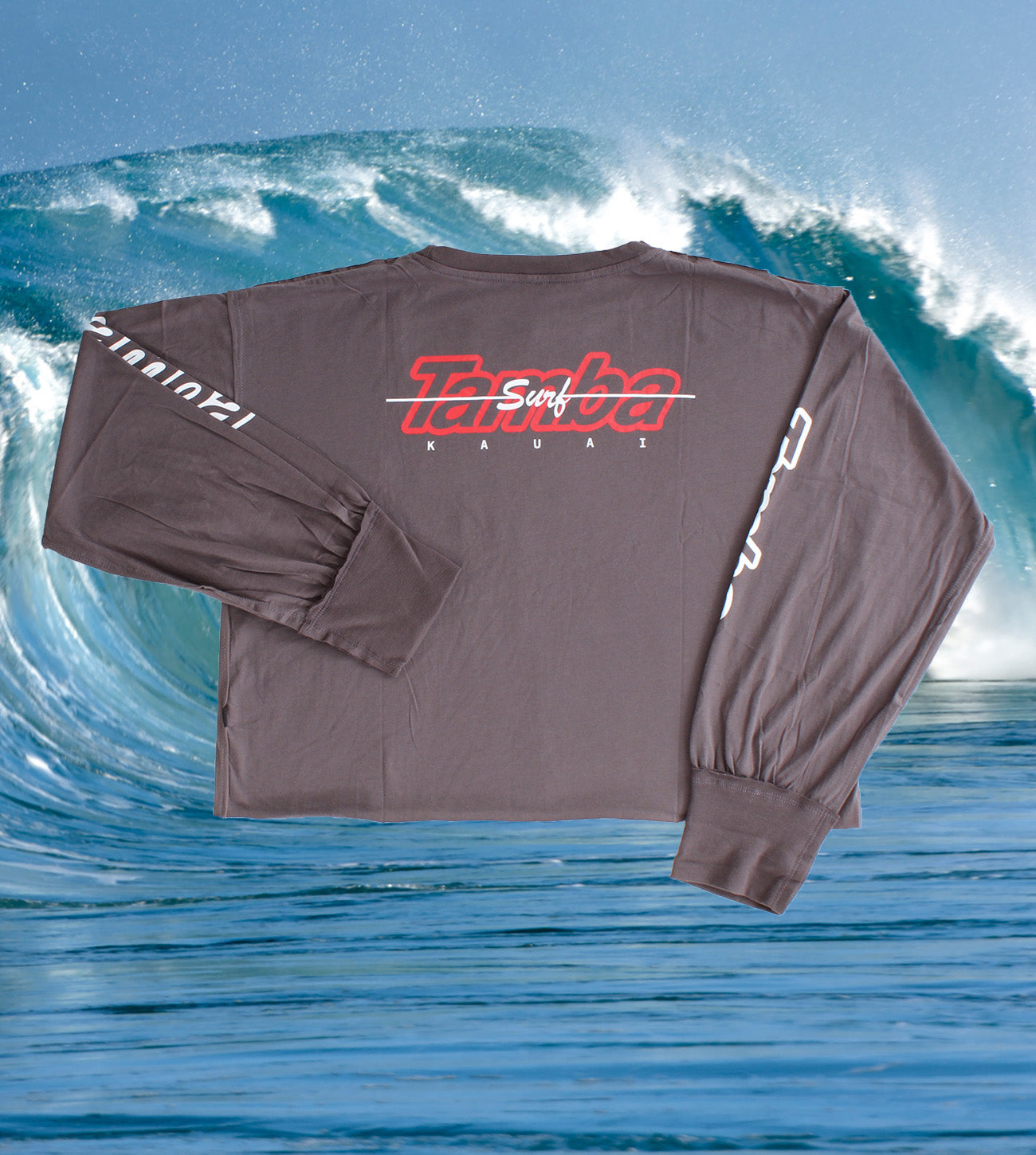 Sunrise, time for coffee and a look at the ocean. How's the surf? Let's go! Cotton knit, a soft cotton with some nice touches like the sewn-in collar band and authentic Tamba tag on hem. Larger print on back