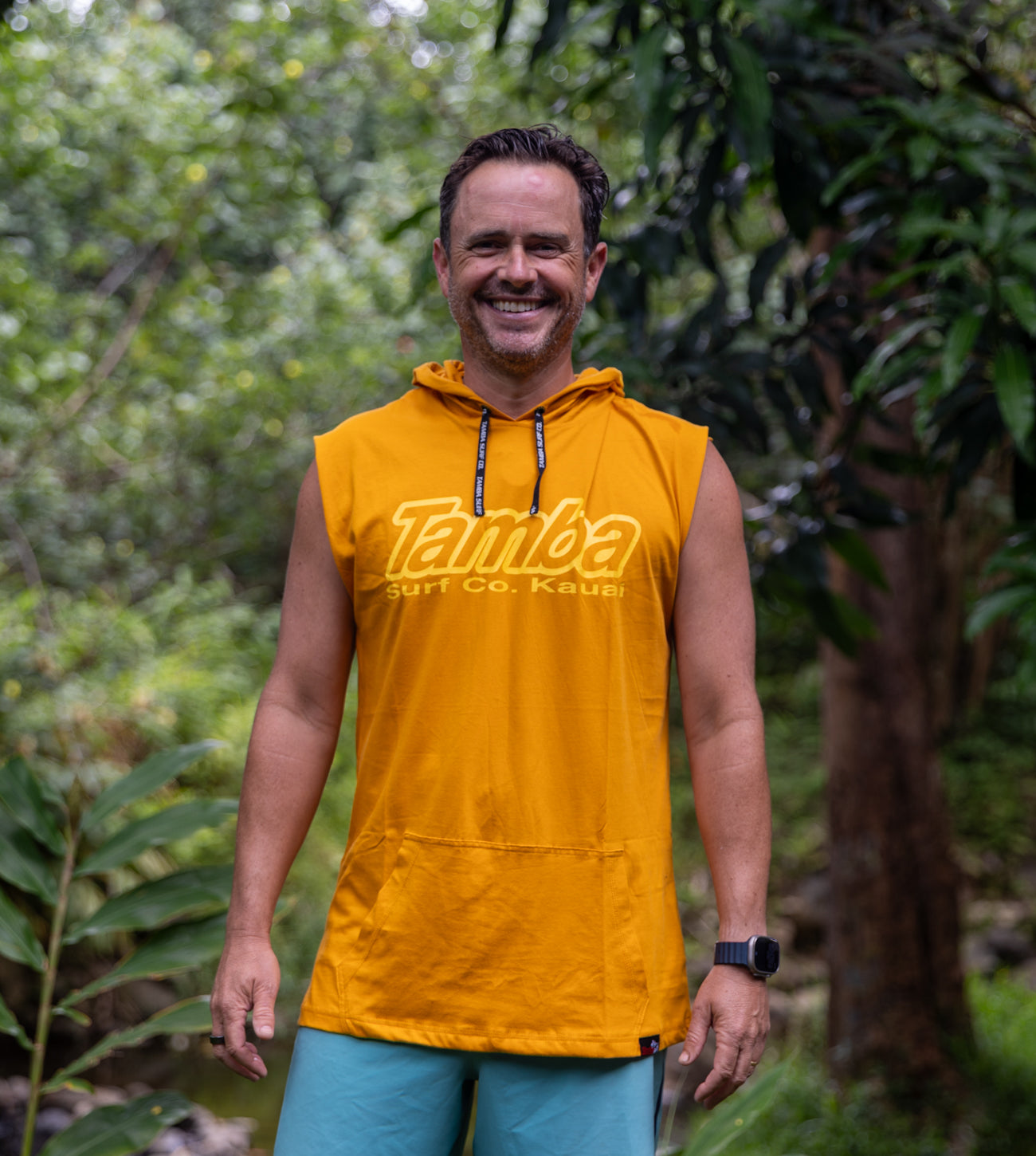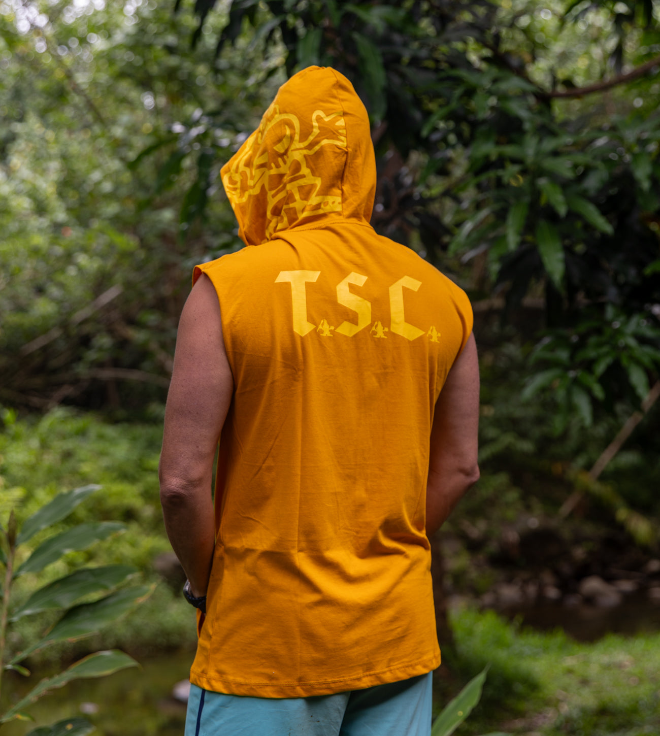 Party on the front, party on the back! Custom-designed tank top shirt with Warrior emblazoned on the hood. Panels are hand sewn. Cotton knit, a soft cotton, with some nice touches like the sewn-in collar band, the authentic Tamba Warrior tag sewn onto the waistline hem, custom Tamba grommets, and Dreams Do Come True drawstring. Front pouch. Larger print on da back.