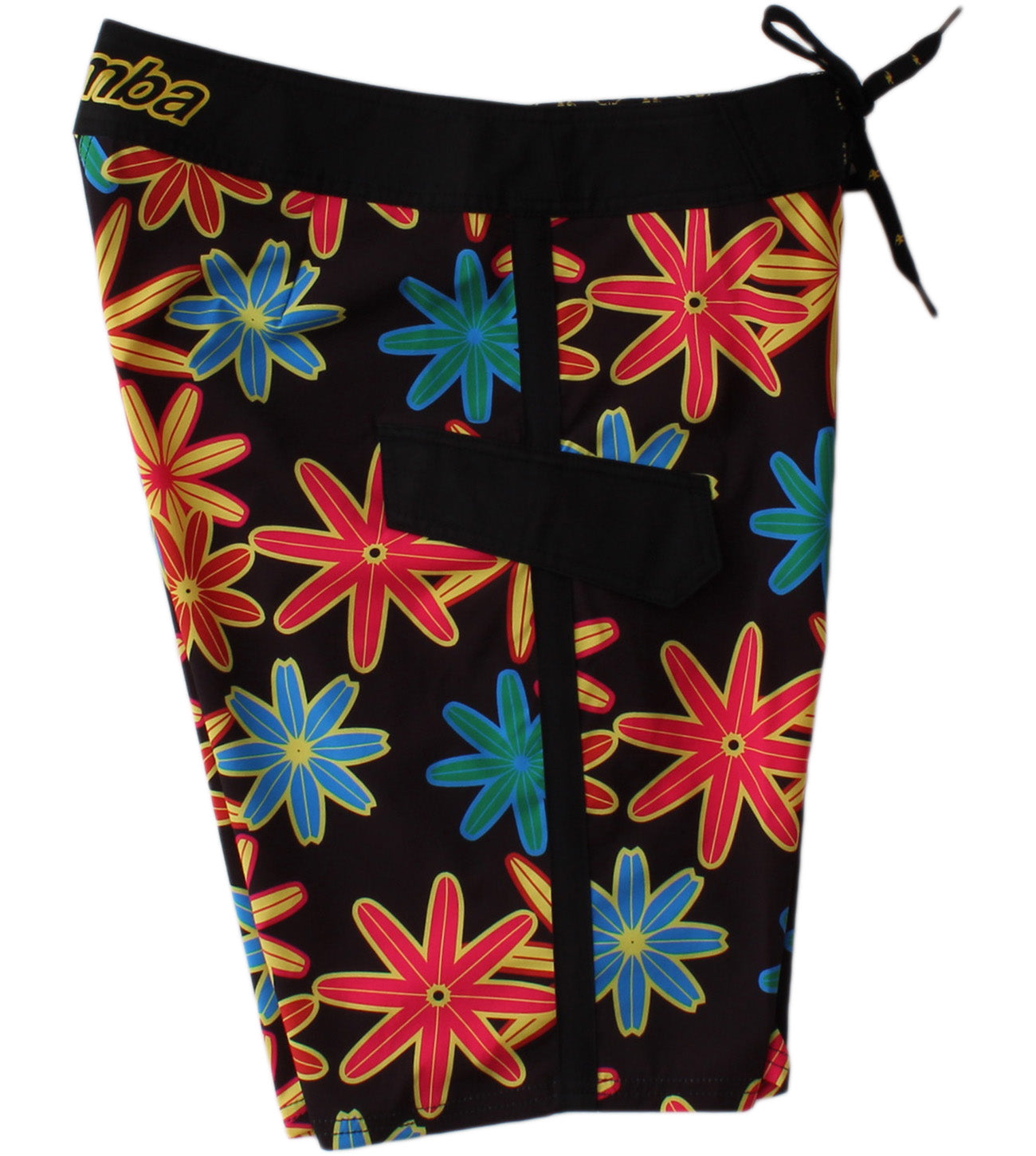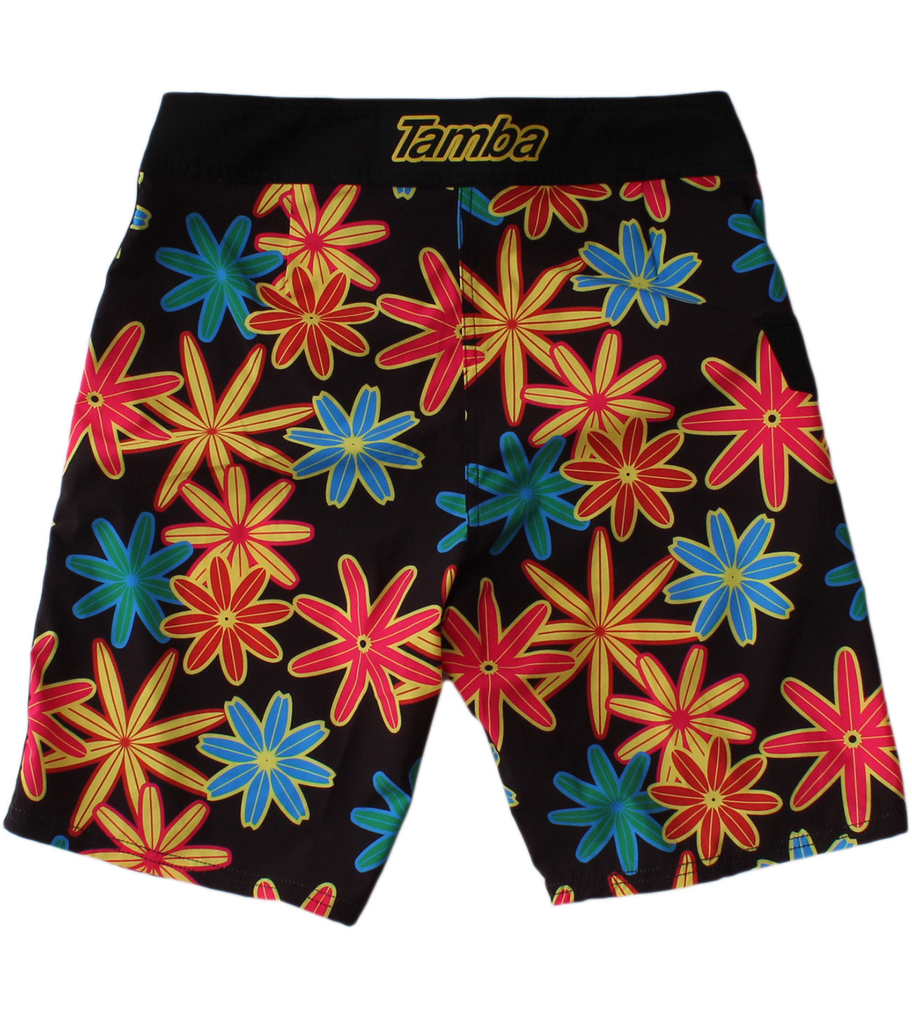 Bold boards bloom like flowers on a field of black. 21-inch outseam, velcro side pocket, Tamba Dreams Do Come True waistband, Tamba emblem on the leg, sturdy Warrior-lined lace tie with custom Tamba grommets, 4-way stretch material, double stitching.