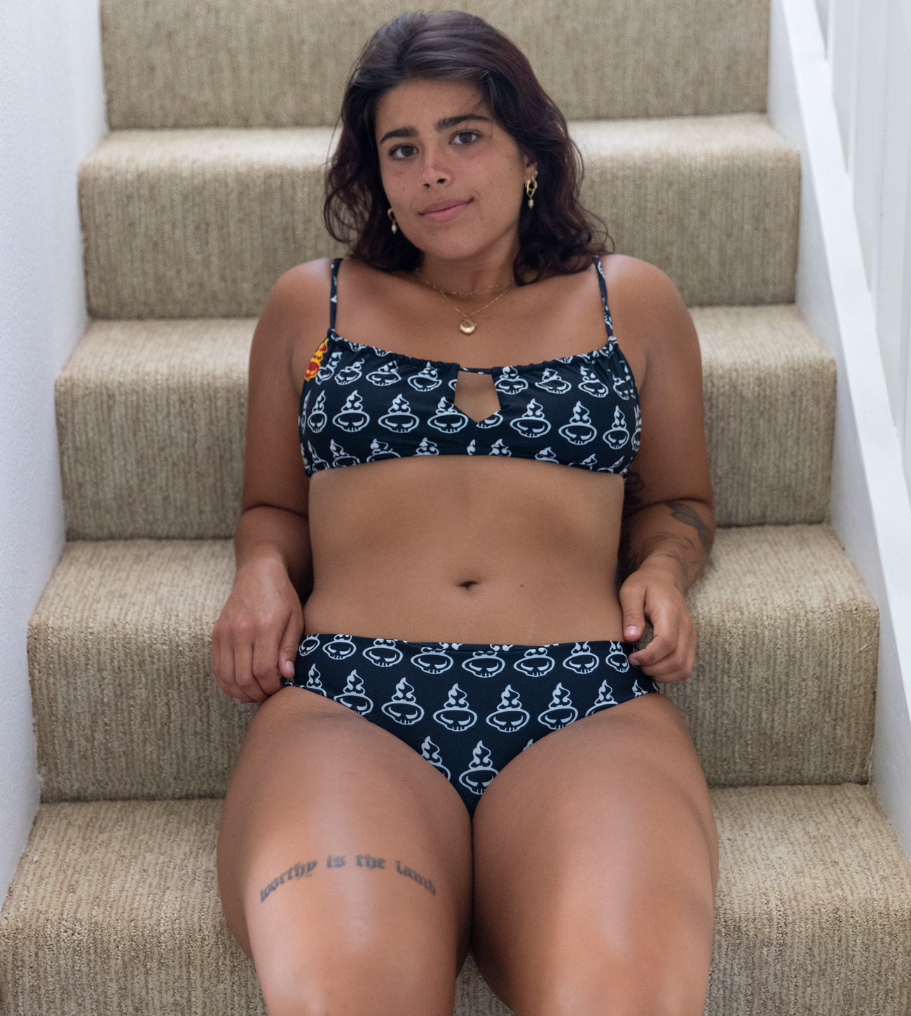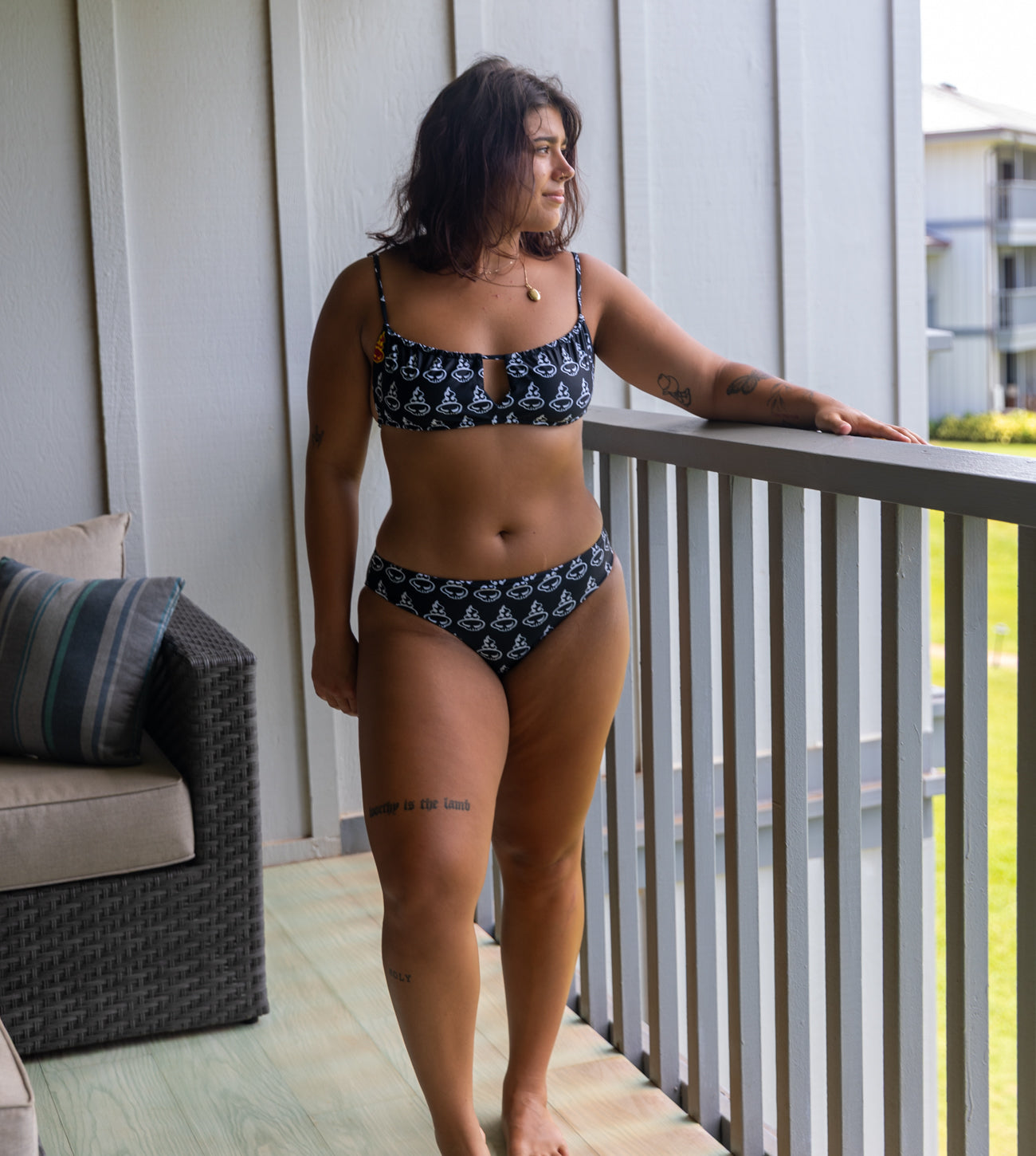 Tamba Spirit Warrior Bottoms #10. These are a full coverage bikini bottom. Comfortable, modest and our go-to for anything from walking on the beach or going out to the river. Multi print with our iconic warrior head.