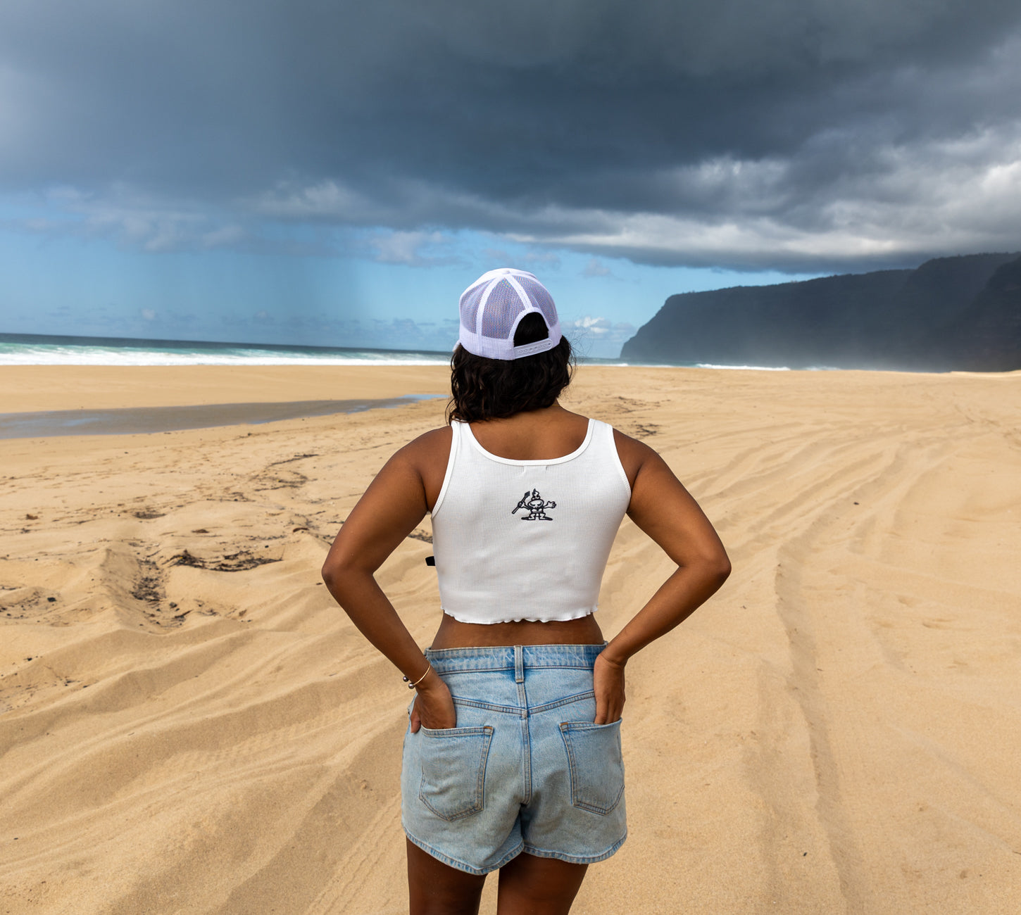 Soft and simple. Ribbed material, sleeveless crop top with ruffle-stitched hemline, small Tamba logo on lower front, and small warrior on center back. Authentic Tamba tag on side hem. 63%viscose, 34% poly, 3% spandex.