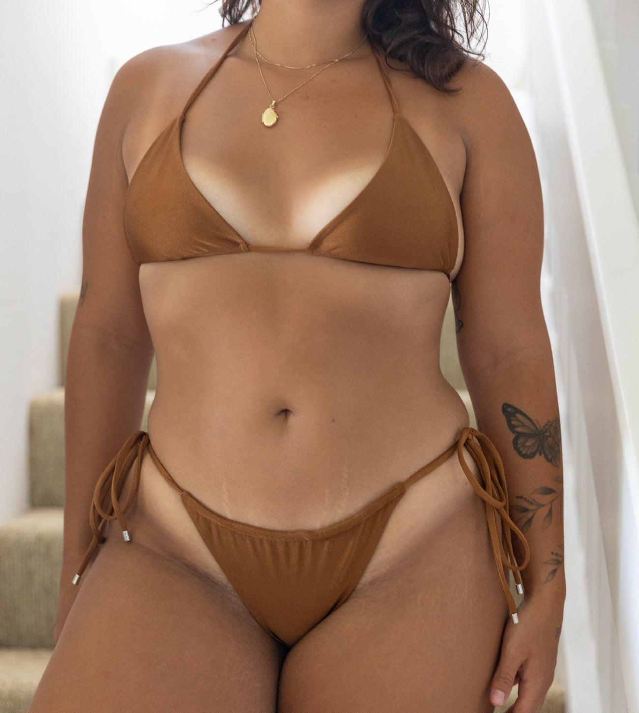 Tamba Cinnamon Bottoms #8. These are a skimpy tie bottom, adorned with metal hardware on the drawstrings. Comfortable, sleek and our go-to for anything from walking on the beach, to tanning.