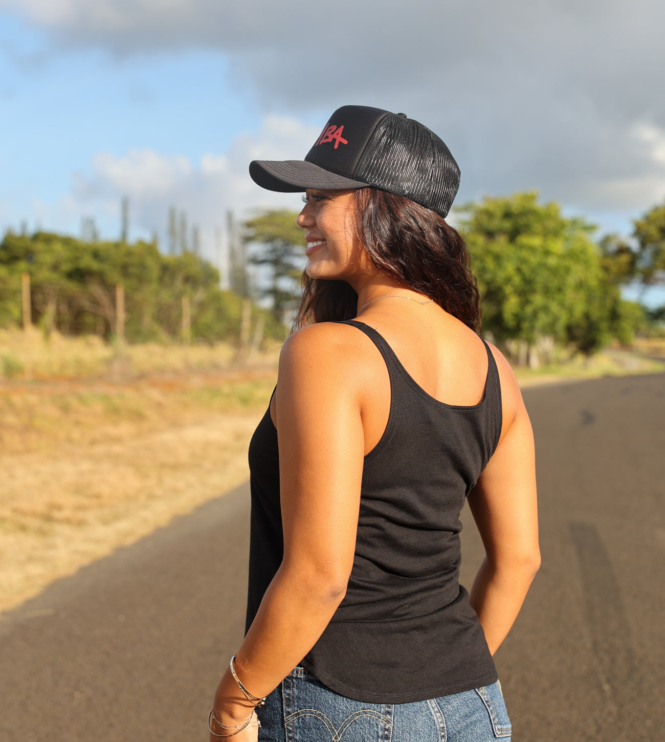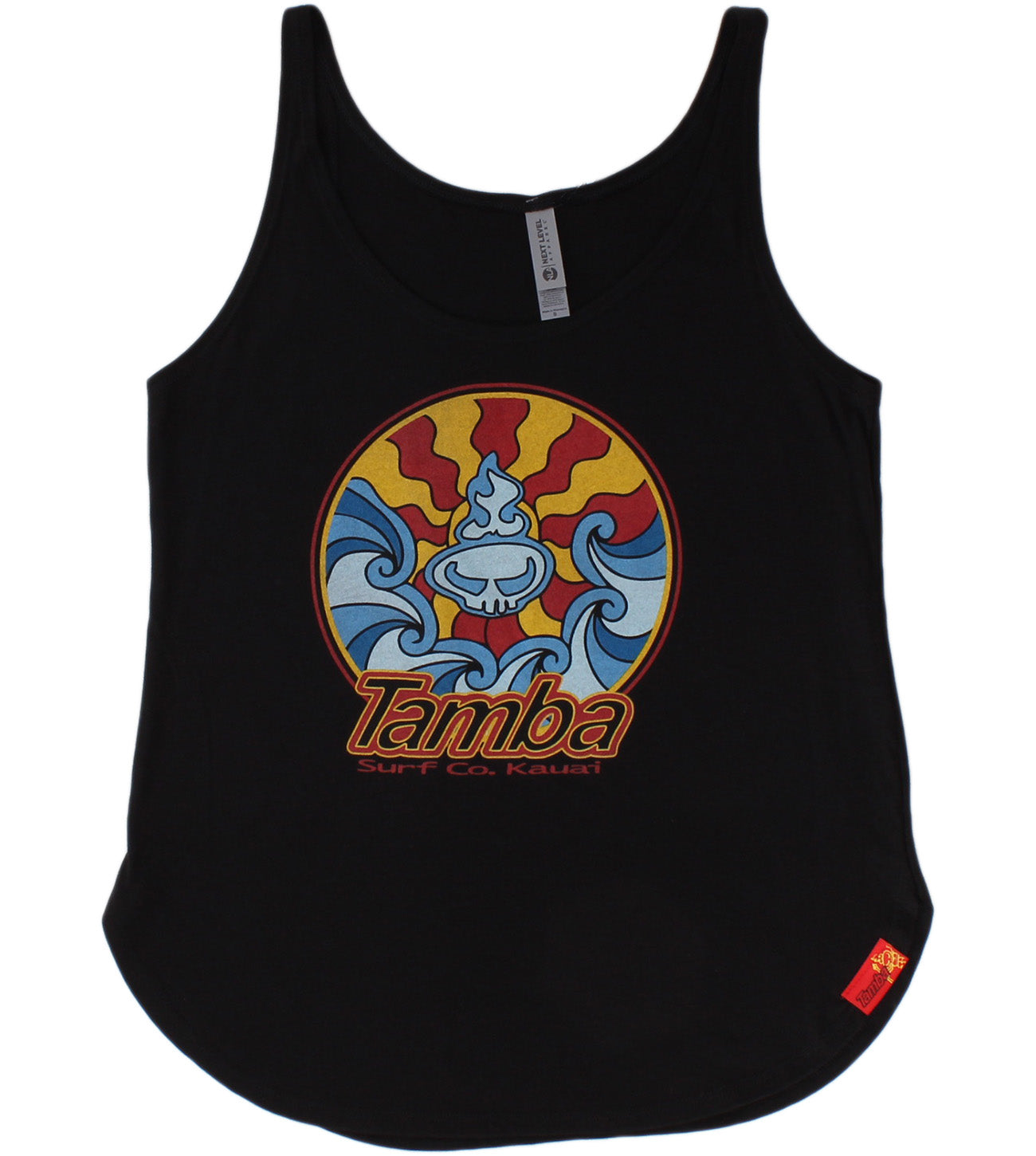 Peace, tranquility, and serenity. Good ol' Kaua'i. Flowy 'Festival' tank top with Tamba 'Maluhia' design, authentic Tamba Warrior tag sewn onto the waistline hem, thin straps, scooped neck, lightweight, 35%/65% cotton-poly blend, print is on the front.