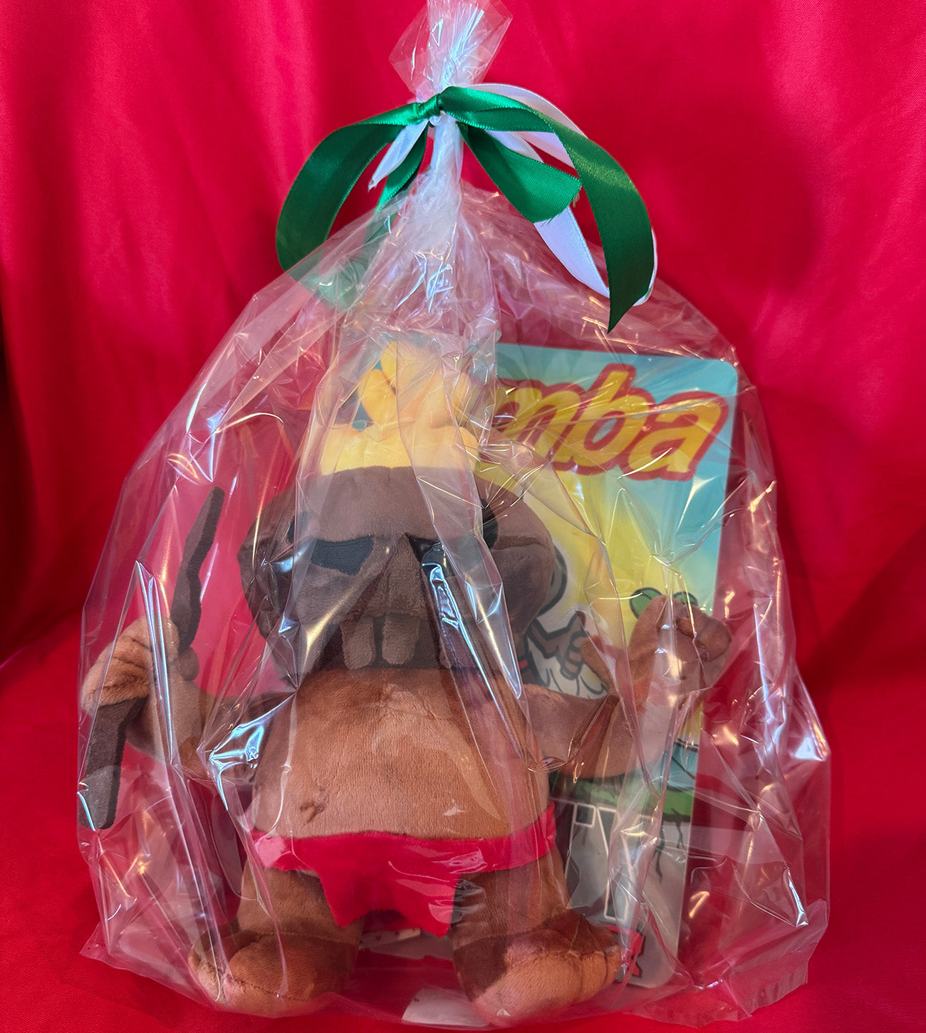 Tamba Man book combined with plush toy, in a celly bag with ribbon, and two small stickers inside too. Ready for gifiting!