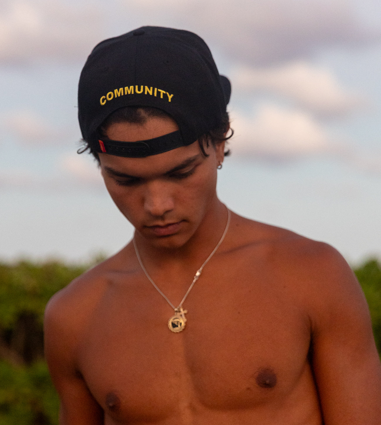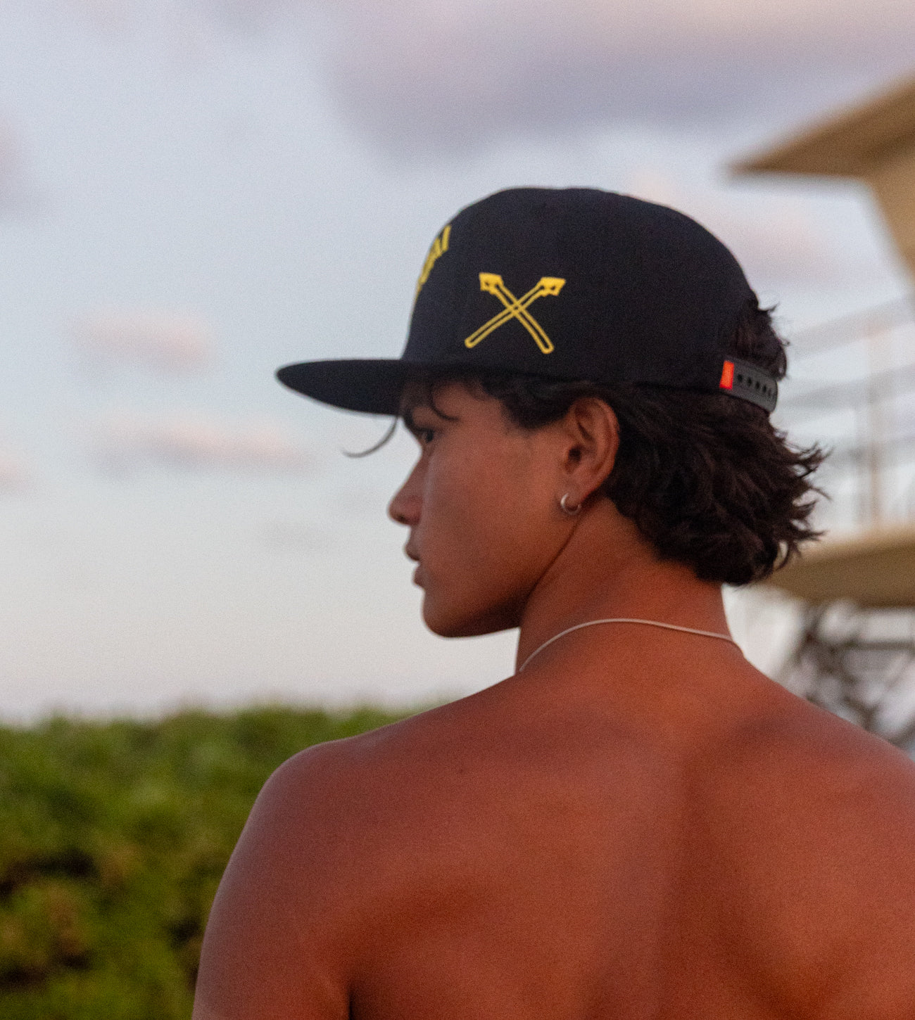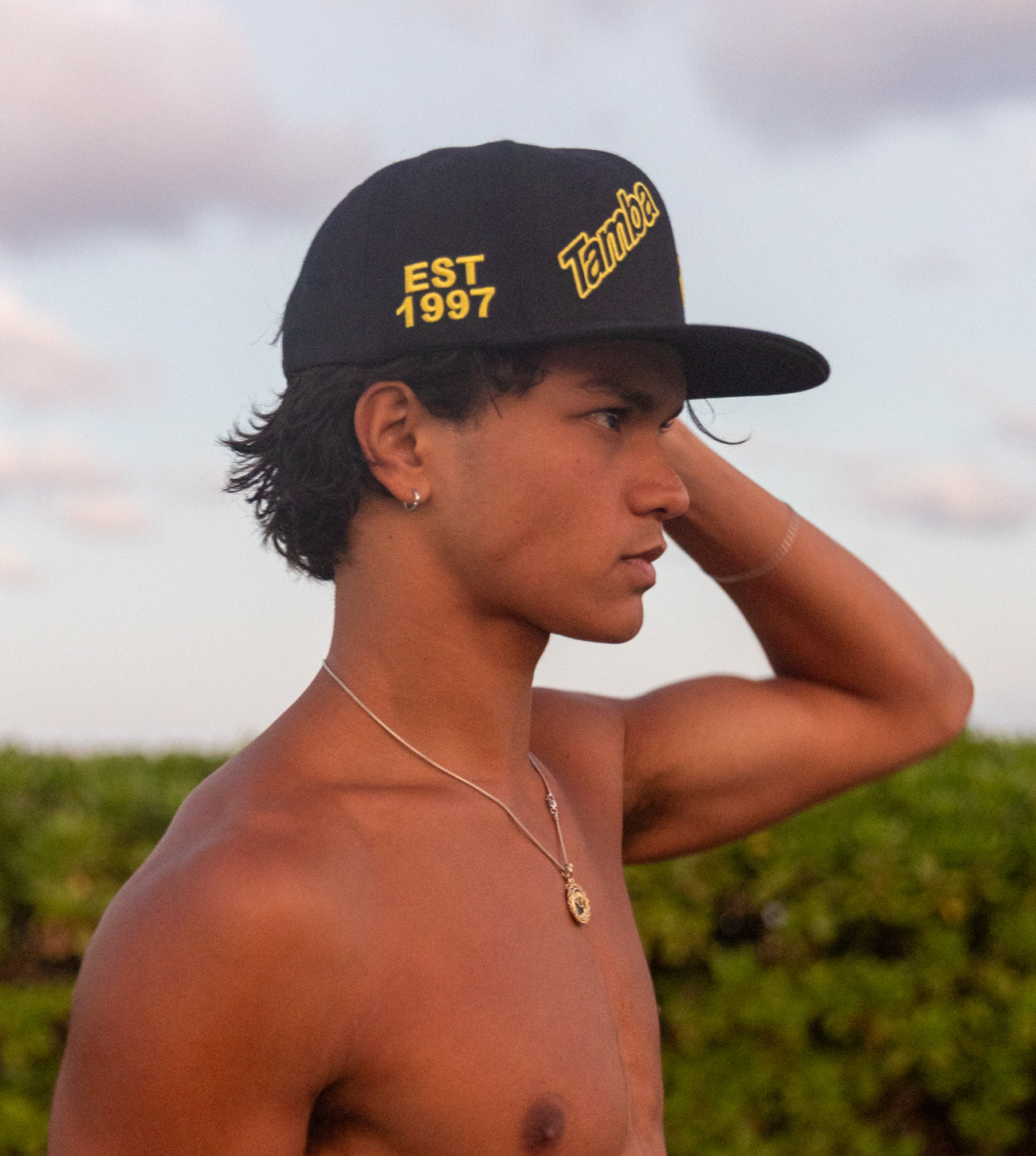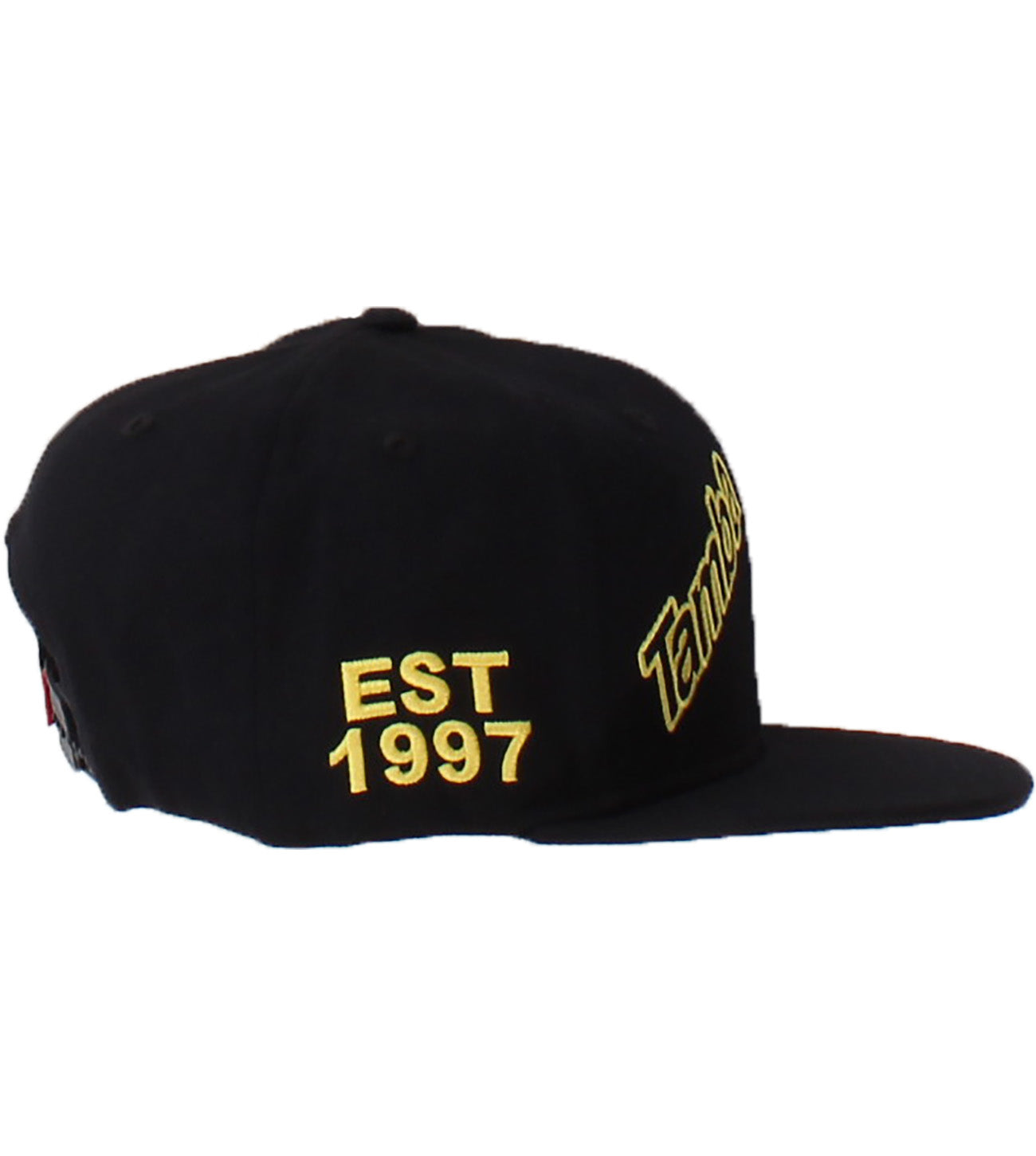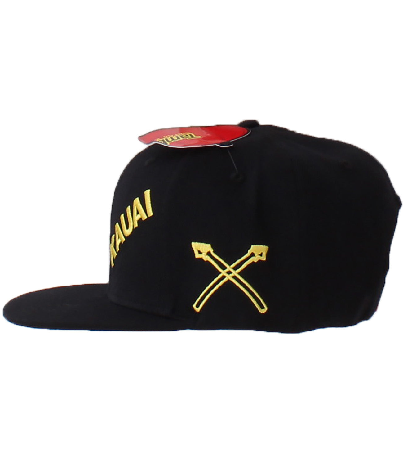 Moving in the right direction! Flat-embroidered Tamba and Kauai on the front, Est 1997 on the right side, and crossed spears on the left side. Black back strap. "Dreams Do Come True" label on inner band, and authentic red Tamba tag on the back strap. And get this: the hat-shaped price tag is a Tamba sticker! 83% Acrylic, 15% wool, 2% PU spandex. High profile, 3-3/4" crown, flat visor, 6-panel construction, snap closure, OSFA (6-1/2" - 7-7/8").