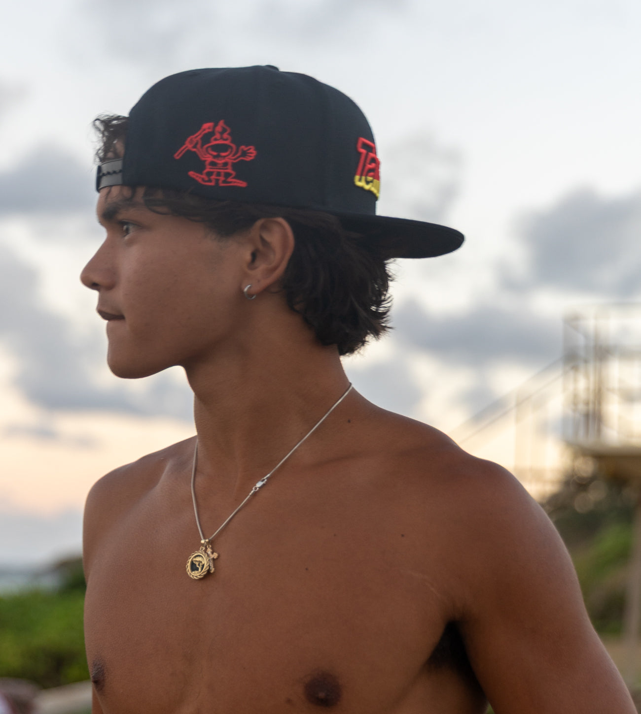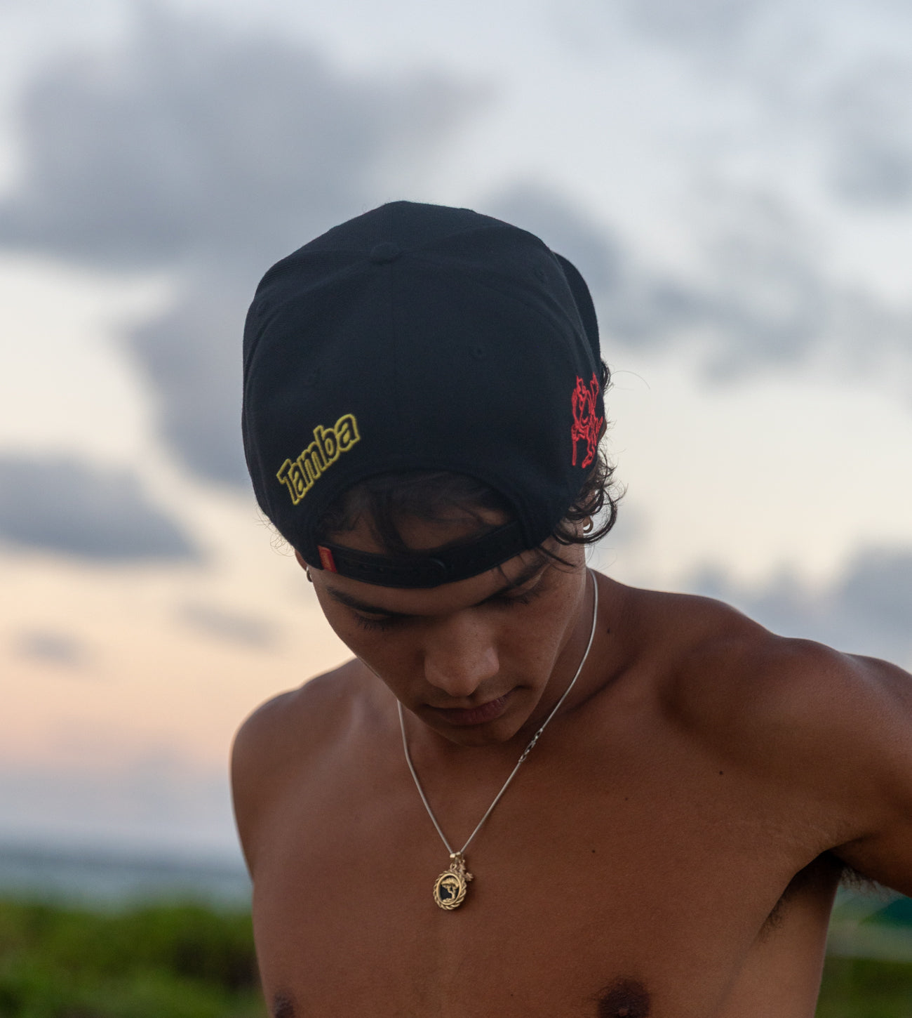 Things are looking up! Classic Tamba 3D logo on front in Red/Yellow gradient colors. Flat embroidered Tamba on back of hat in yellow and classic Warrior on back/right side in red. "Dreams Do Come True" label on inner band, and authentic red Tamba tag on the back strap. And get this: the hat-shaped price tag is a Tamba sticker! 83% Acrylic, 15% wool, 2% PU spandex. High profile, 3-3/4" crown, flat visor, 6-panel construction, snap closure, OSFA (6-1/2" - 7-7/8").