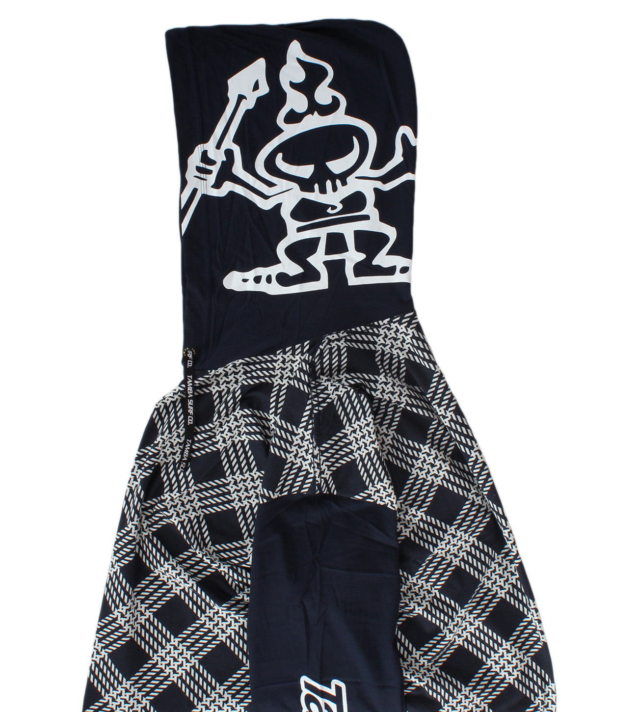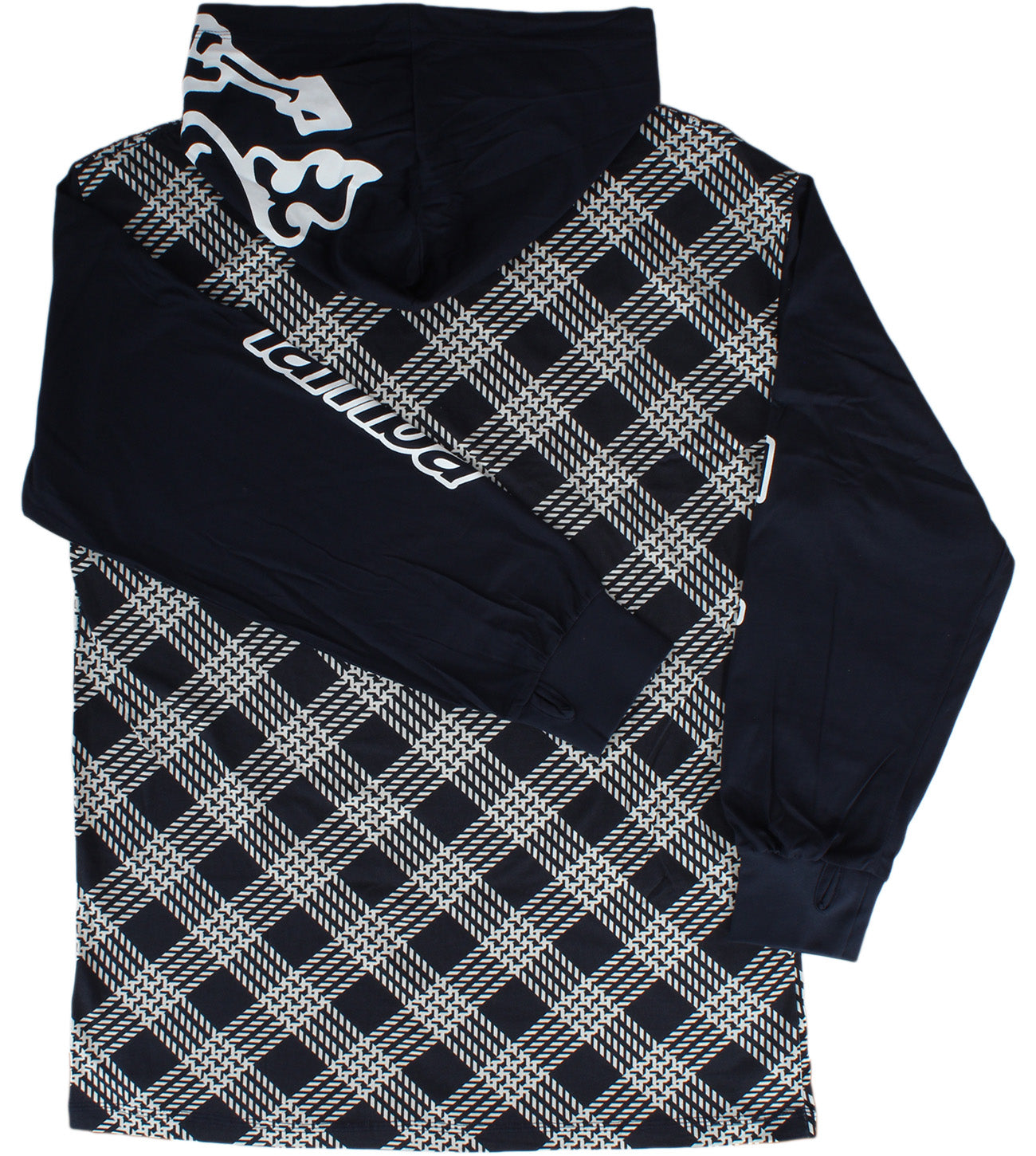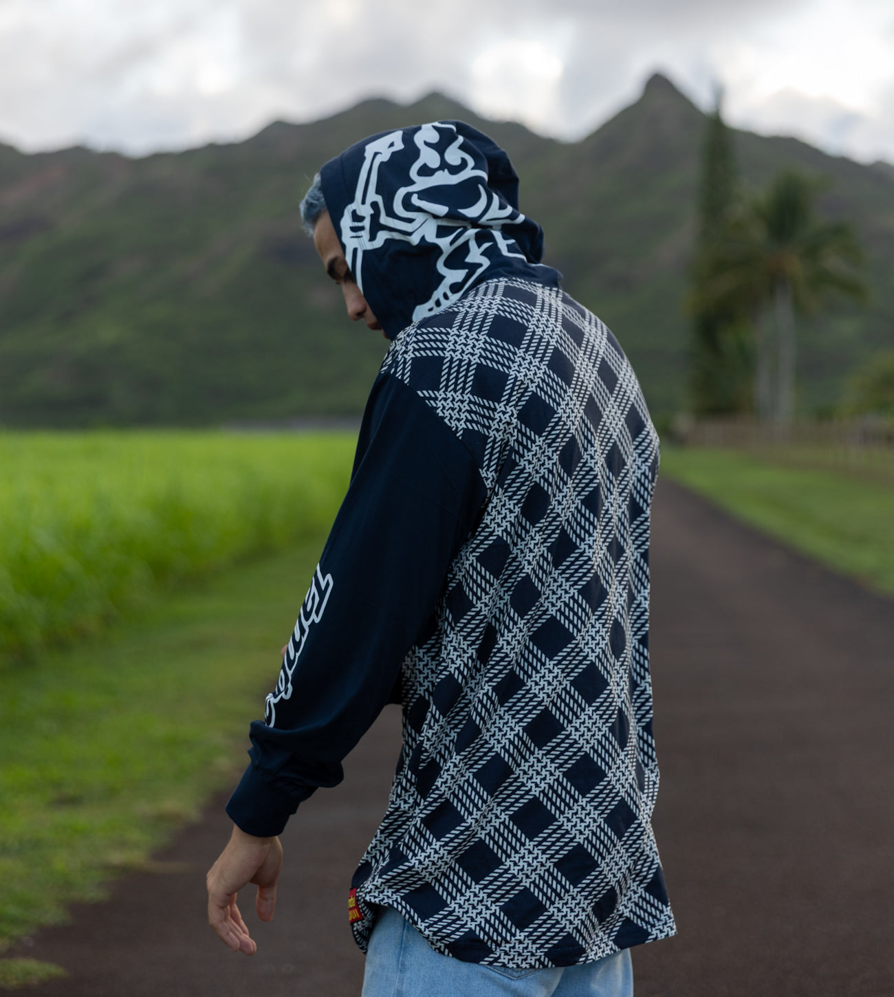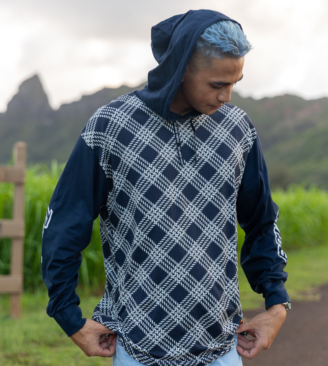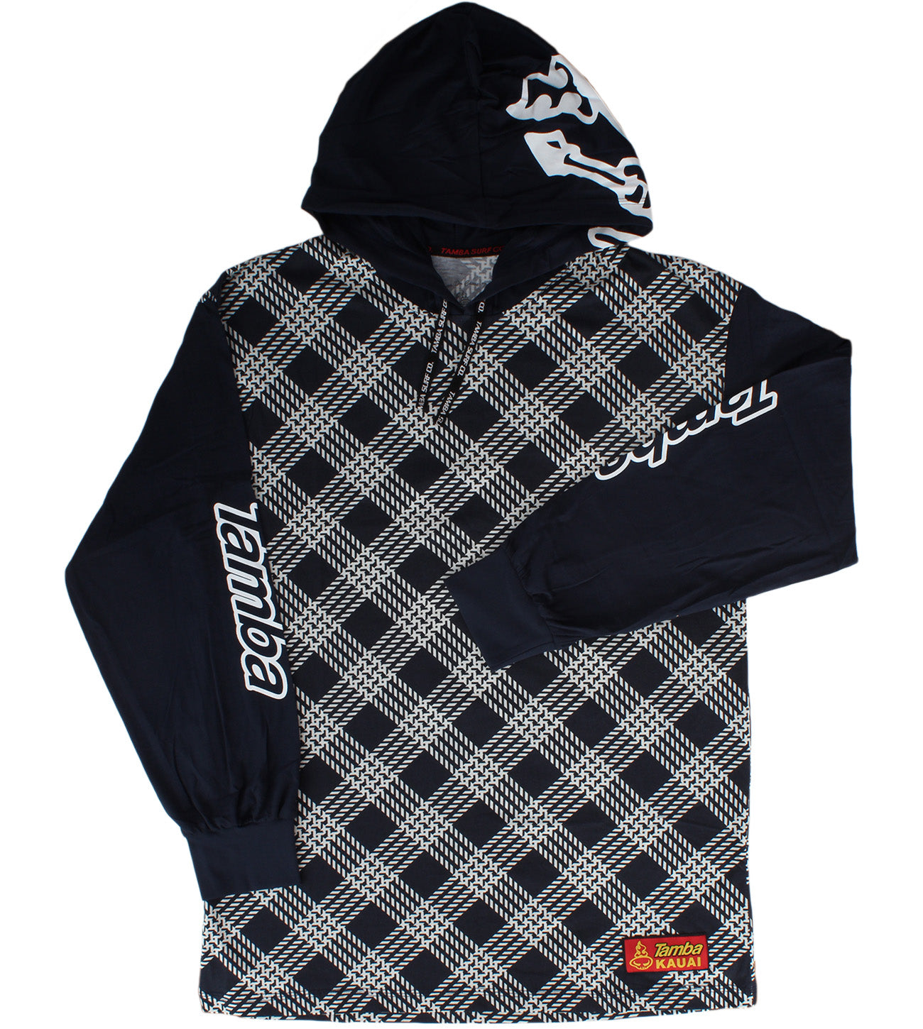Palaka is Hawai'i's plaid! Tune in and let go. Cotton knit, a soft cotton with some nice touches like the sewn-in collar band, custom Tamba grommets, and authentic Tamba Kaua'i tag on front. Full-wrap sublimation print on body, arms and hood are solid color navy with Tamba logos. Warrior on the hood.