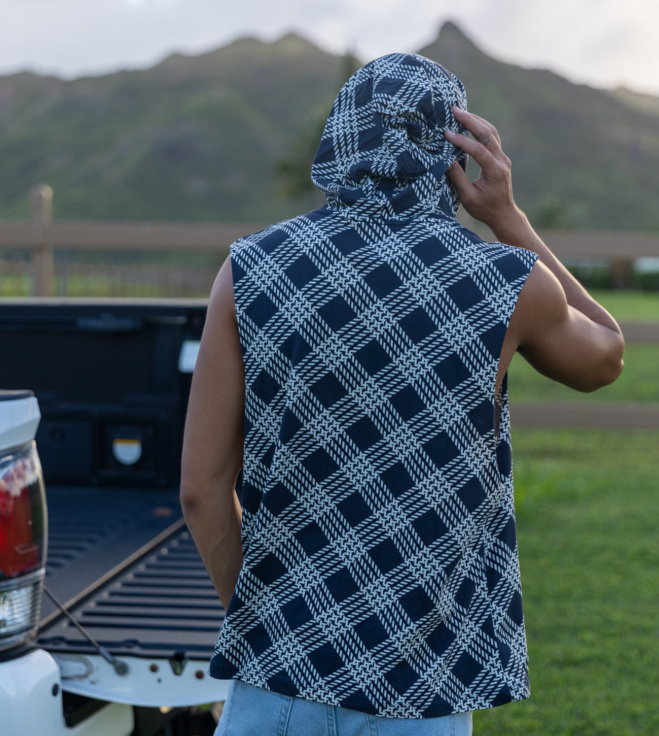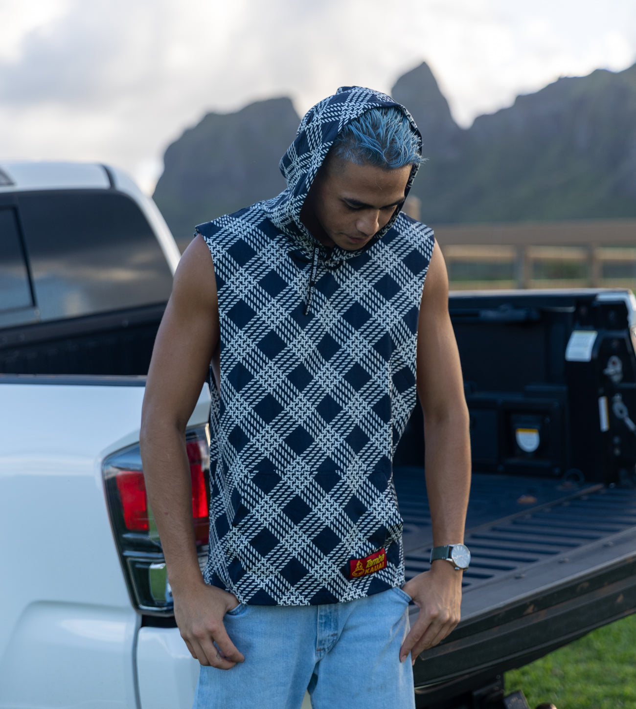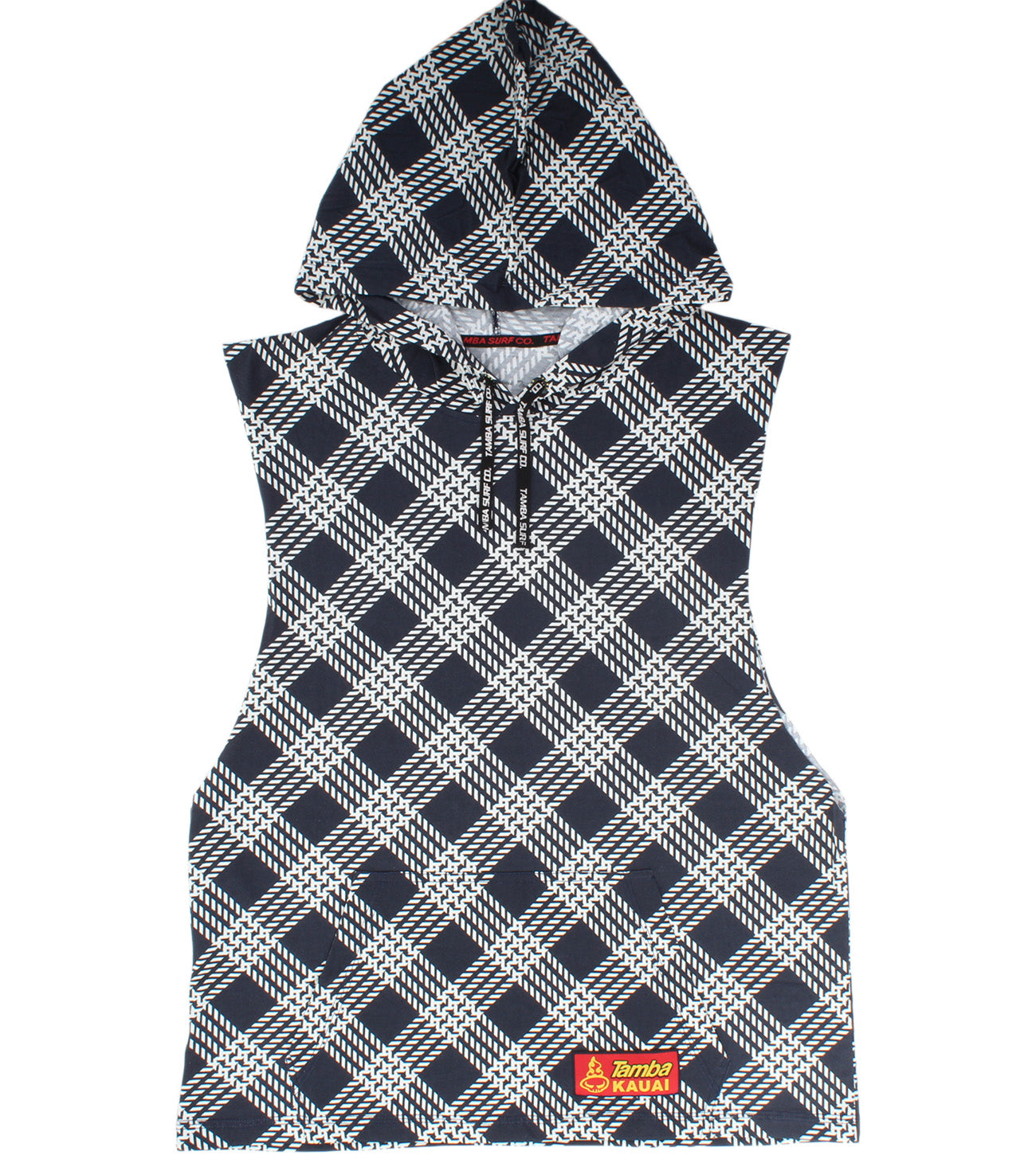 Palaka is Hawai'i's plaid! Tune in and let go. Cotton knit, a soft cotton with some nice touches like the sewn-in collar band, authentic Tamba Kaua'i tag on front, and front pouch. Full-wrap sublimation print.