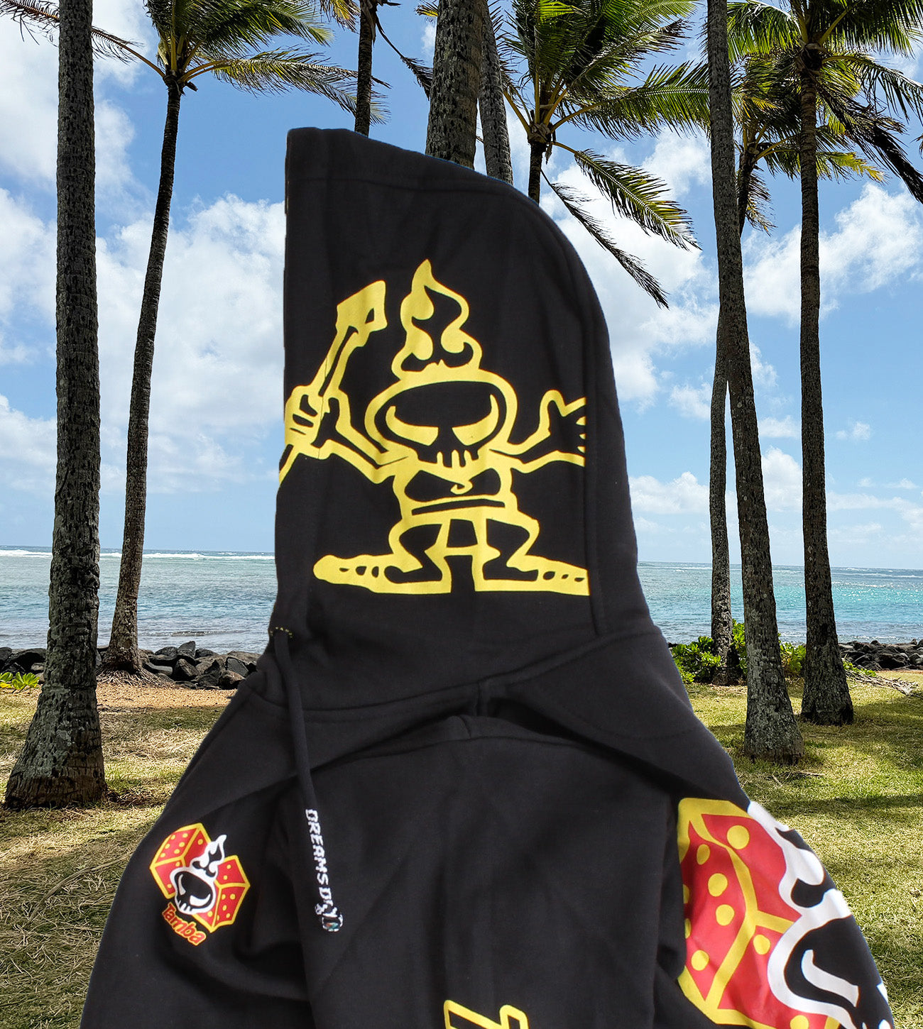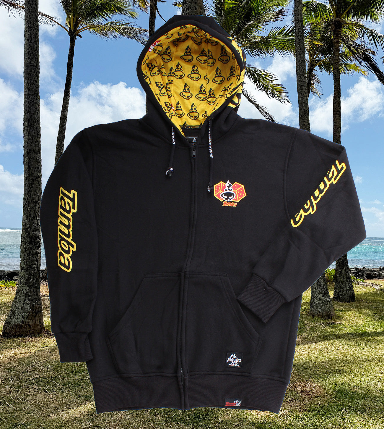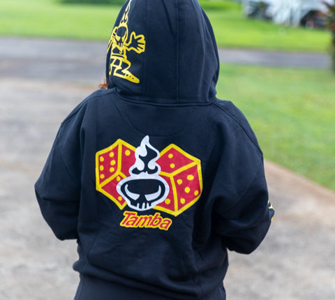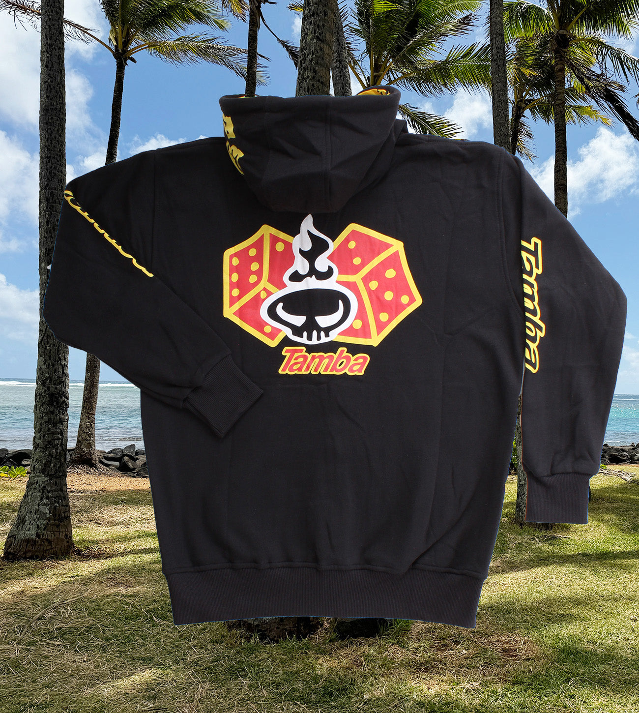 Your lucky dice will never let you down! 60%-40% cotton/poly blend, with some nice touches like the thick, sturdy 'Dreams Do Come True' drawstrings, custom Tamba grommets, lined hood, Warrior emblem sewn onto the left pocket, and the authentic Tamba Warrior tag sewn onto the waistline hem. Two front pockets. YKK zipper. Larger print is on da back, with warrior on one side of the hood and tamba logo on both sleeves. Just. For. You.