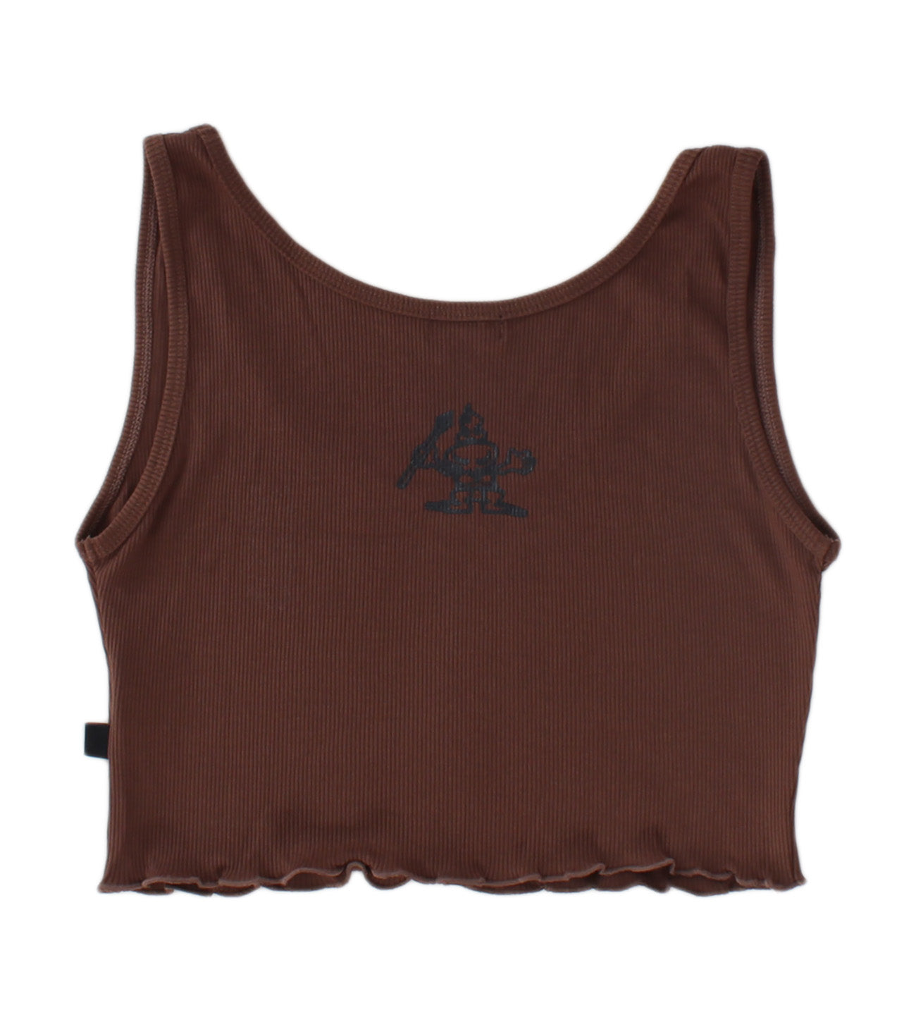 Soft and simple. Ribbed material, sleeveless crop top with ruffle-stitched hemline, small Tamba logo on lower front, and small warrior on center back. Authentic Tamba tag on side hem. 63%viscose, 34% poly, 3% spandex.