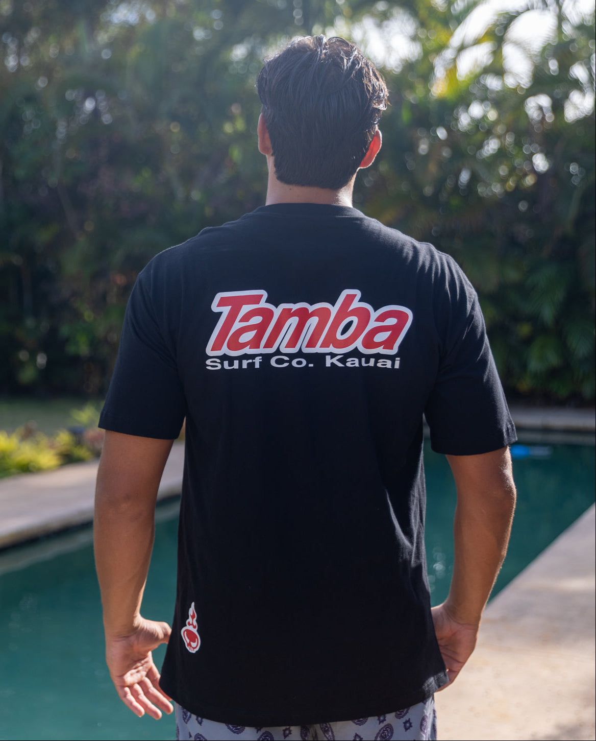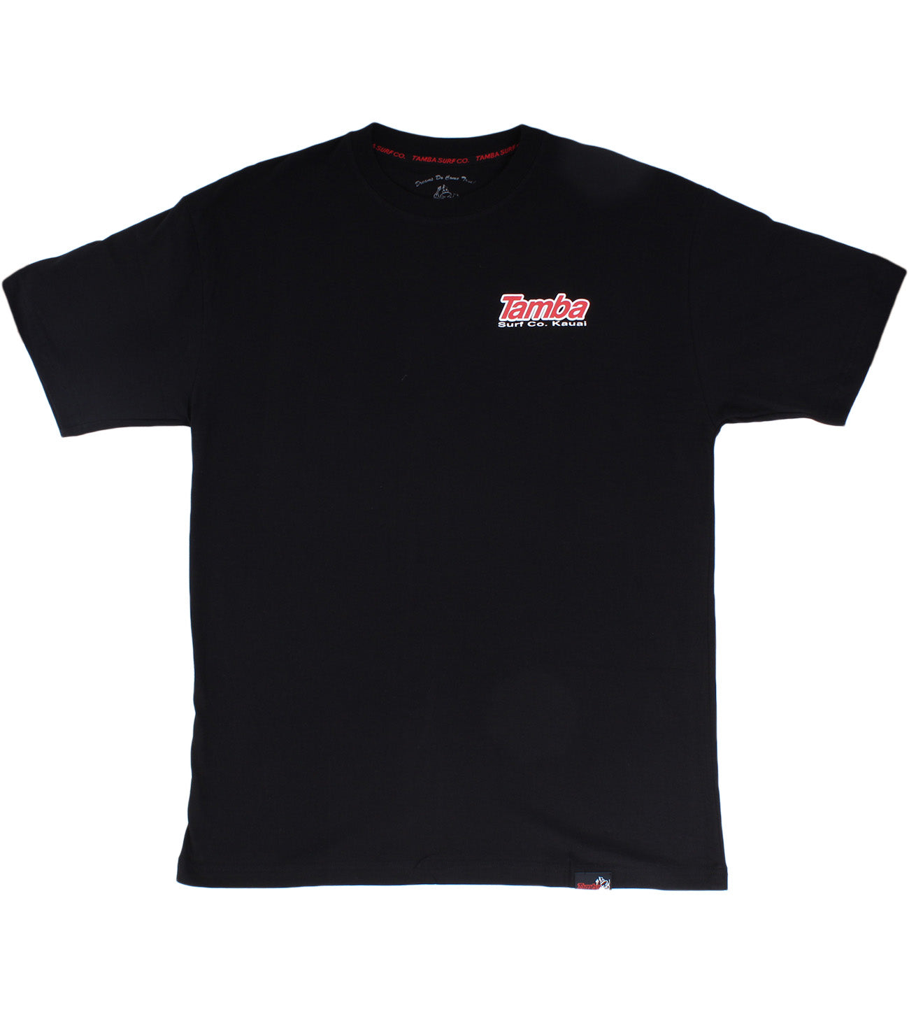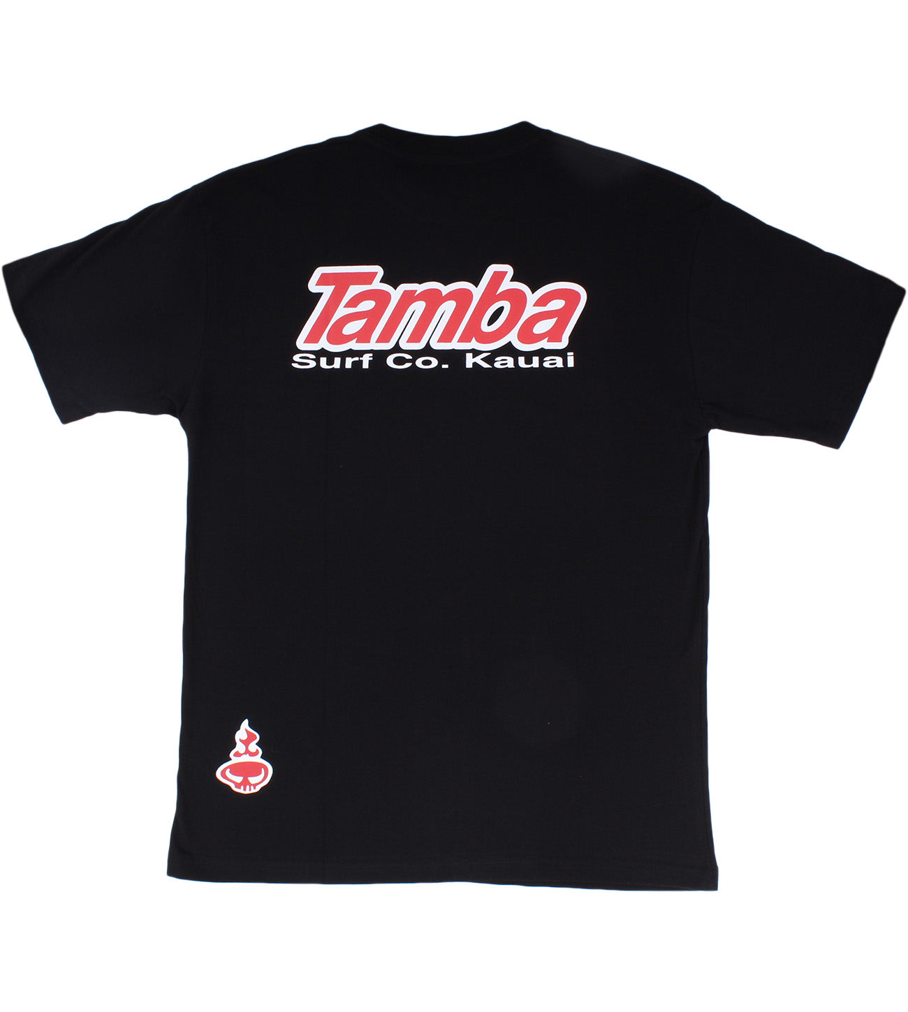 The classic Tamba Surf Co Kaua'i logo, a true original. Cotton knit, a soft cotton, with some nice touches like the sewn-in collar band and the authentic Tamba Warrior tag sewn onto the waistline hem. Larger print is on da back, with Warrior also on lower-left-back!