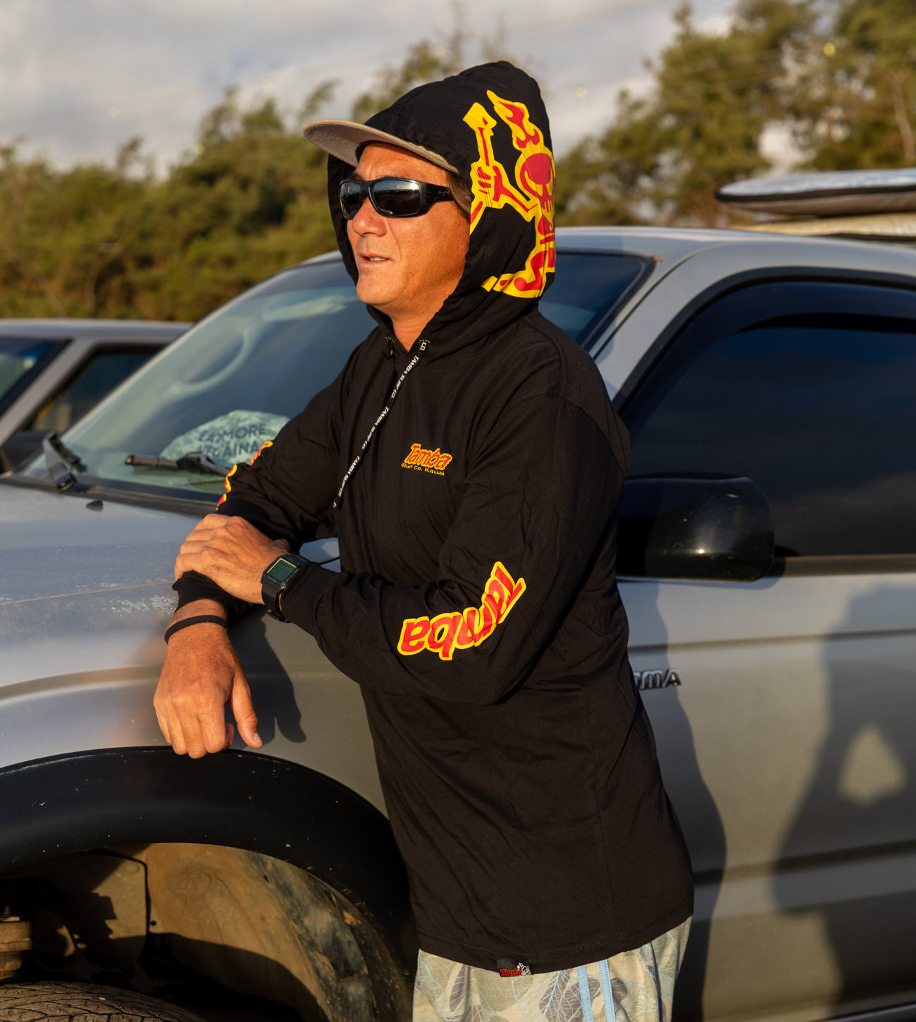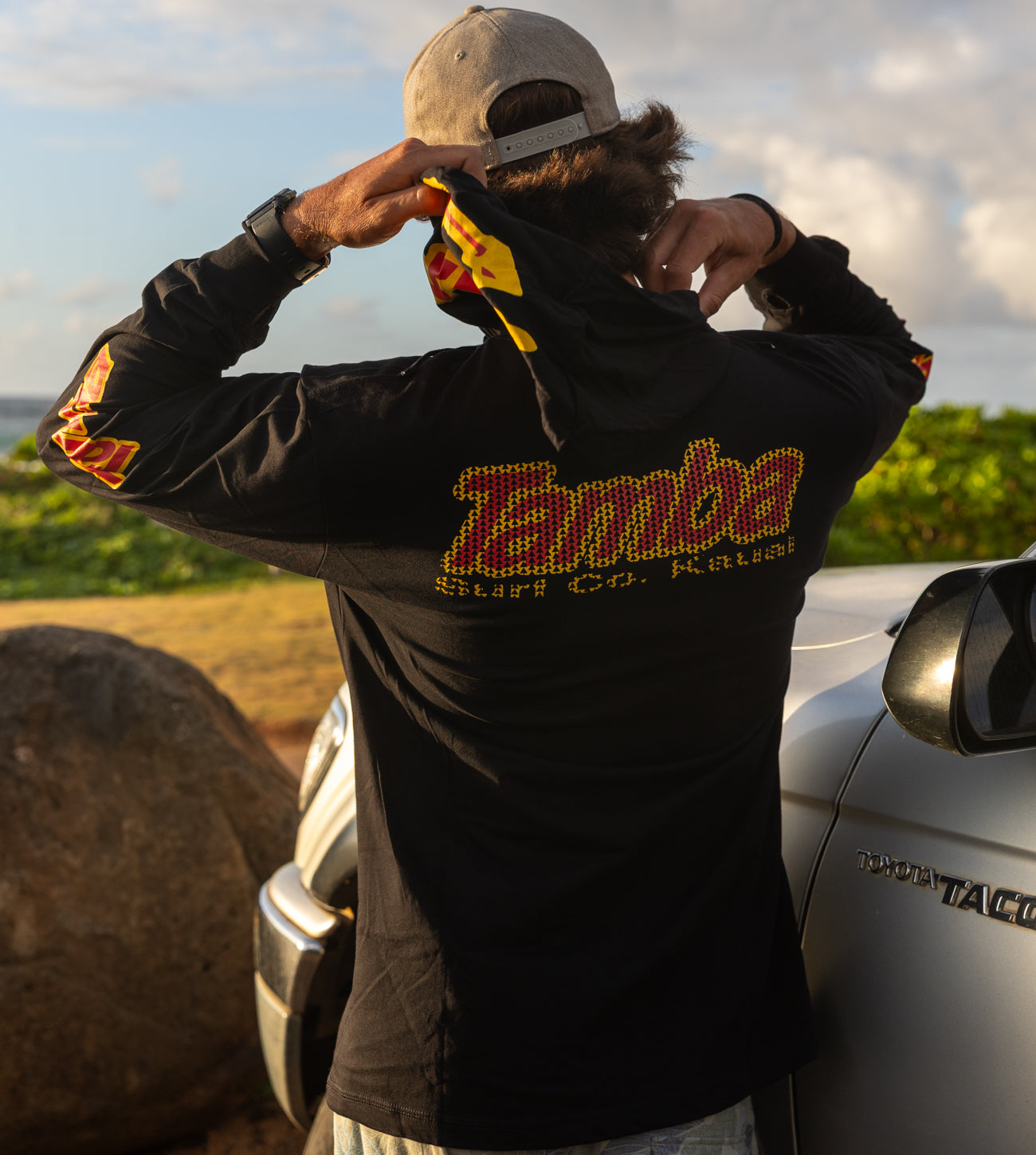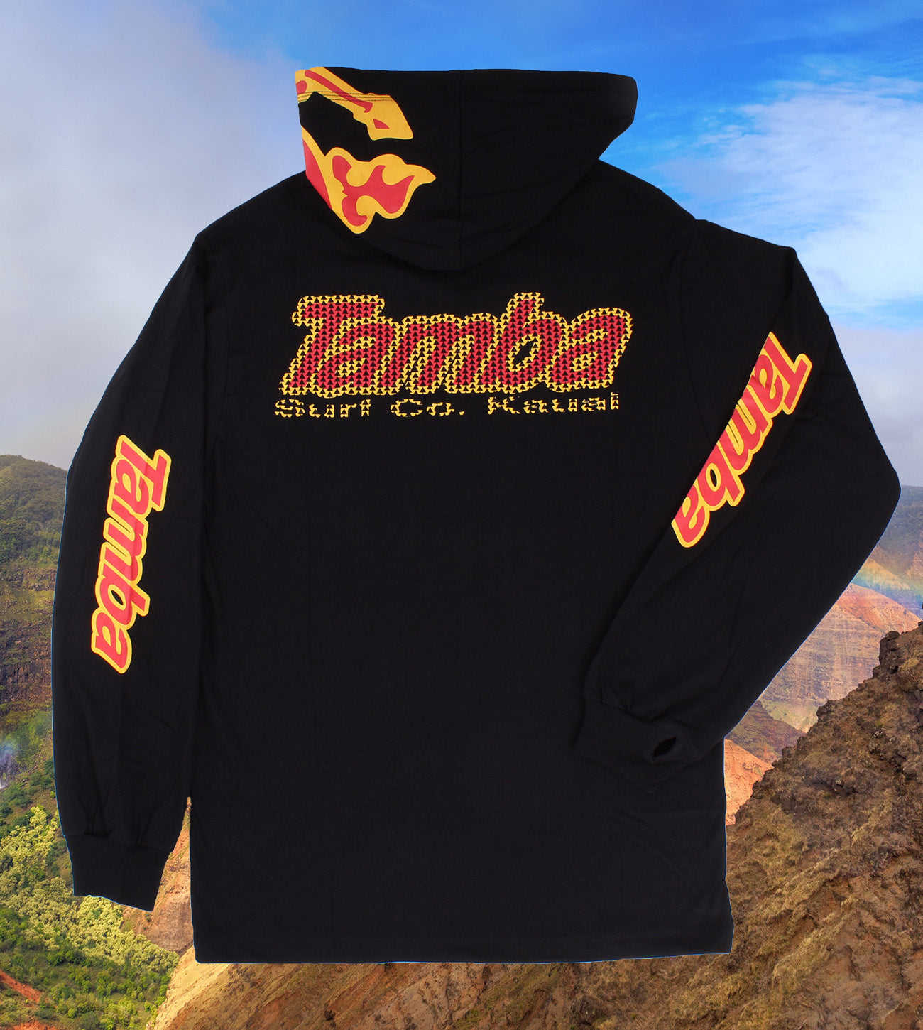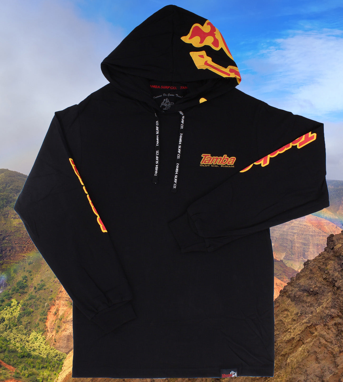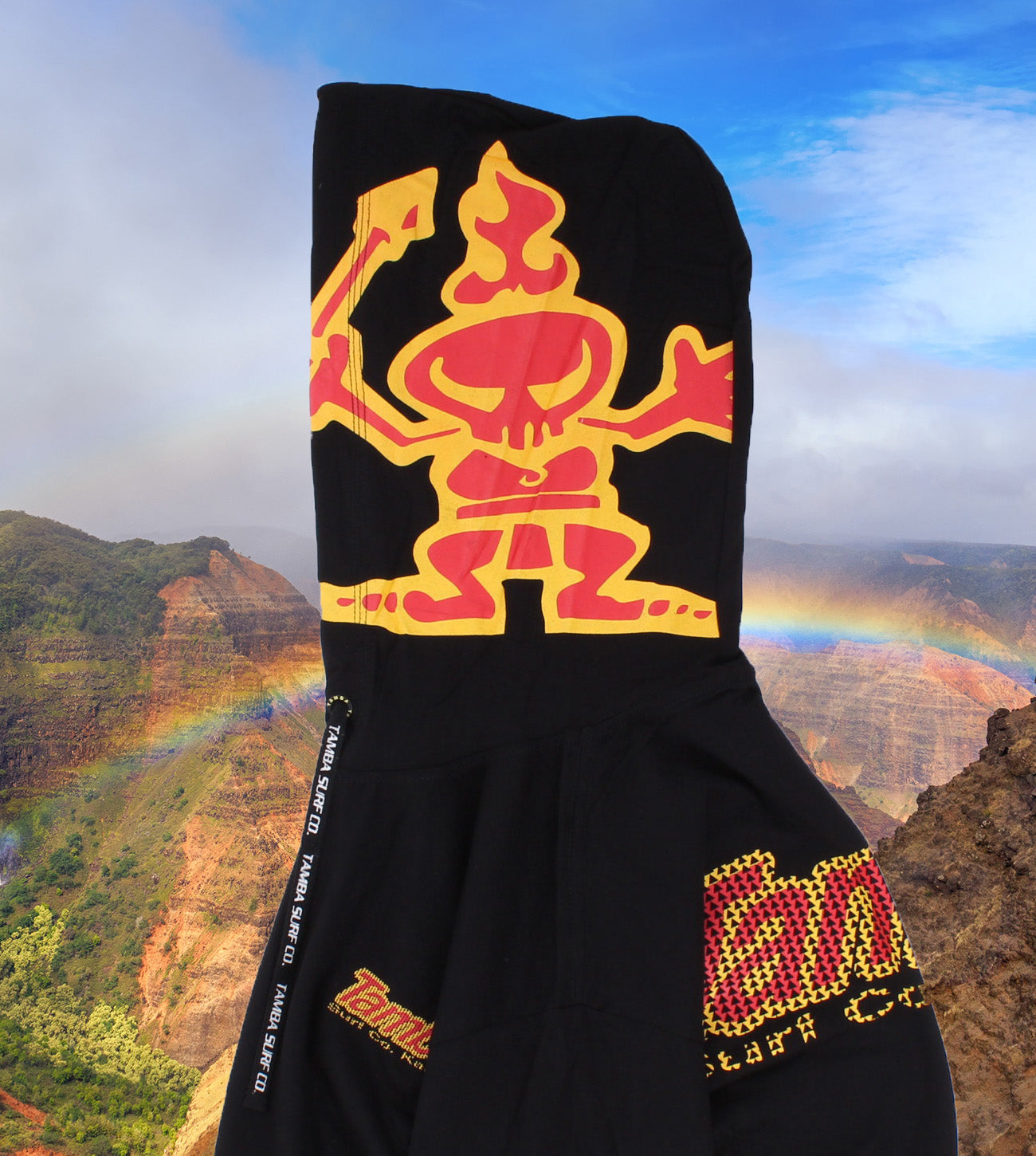 Tri it. You'll like it. Classic Surf Co logo bespeckled with tiny tribal triangles. Custom-designed long sleeve shirt with Warrior emblazoned on the hood. Panels are hand sewn. Cotton knit, a soft cotton, with some nice touches like the sewn-in collar band, the authentic Tamba Warrior tag sewn onto the waistline hem, custom Tamba grommets, and Dreams Do Come True drawstring. Larger print on da back. Logo on both sleeves! Thumb holes in cuffs!